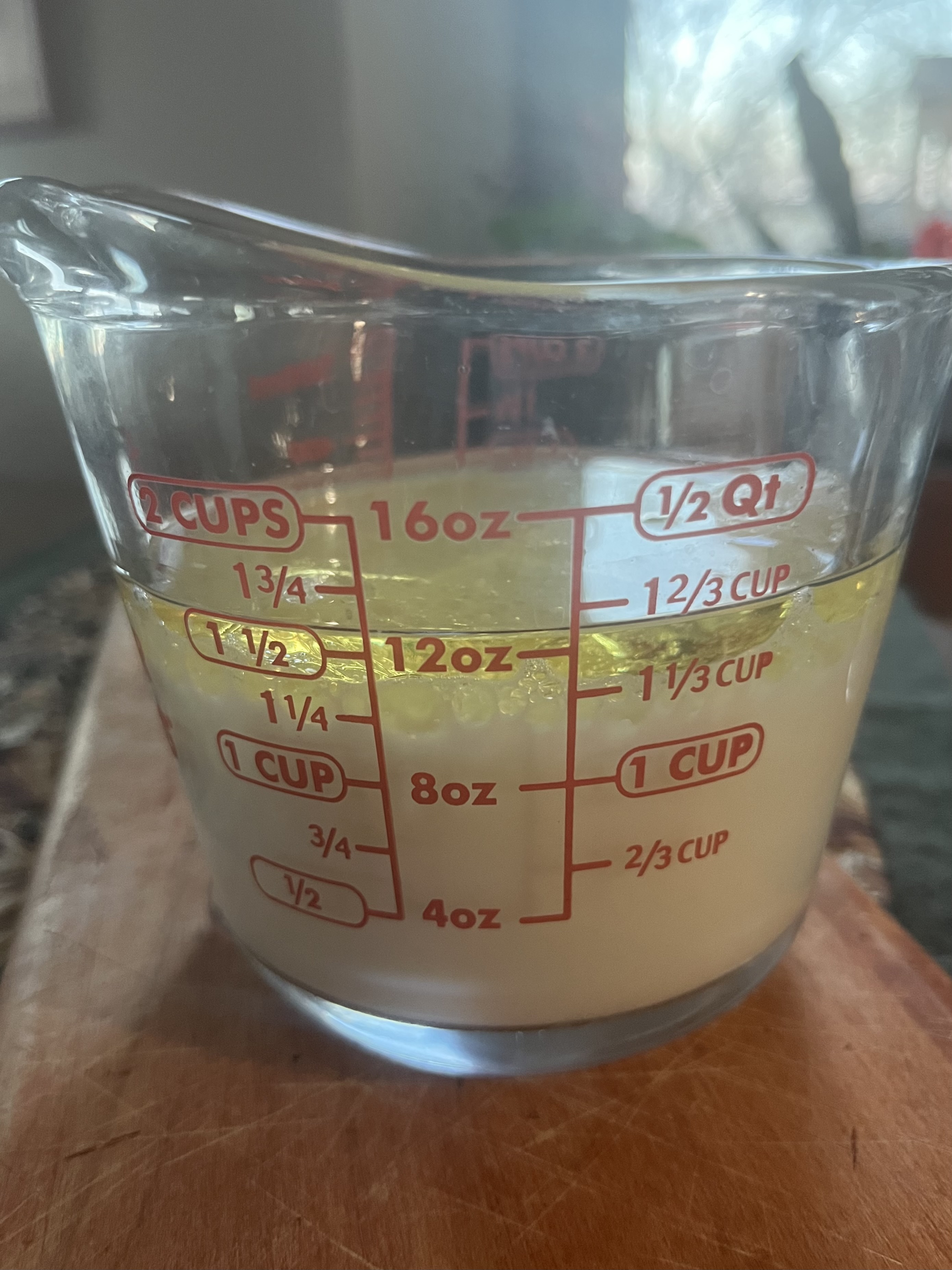 *Simplify measuring liquid ingredients by using a 2-cup measuring cup if you have one and aren’t measuring your liquids by weight on a scale. With this recipe, for example, start with the milk (one cup), add the oil (up to 1 1/3 cups) and then whisk in the egg. Use all room-temperature ingredients. See right photo.