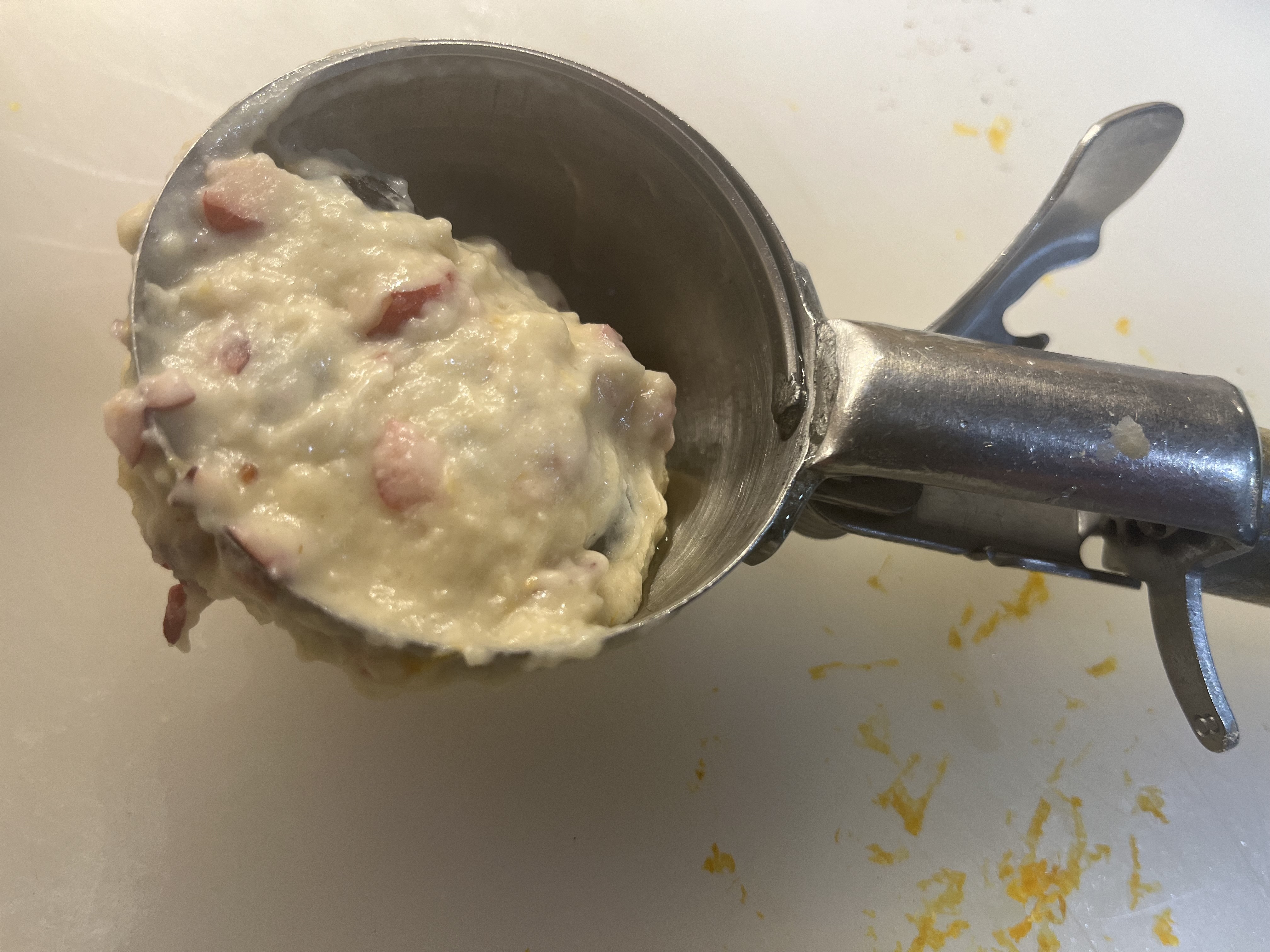 *Use a cooking sprayed or greased ice cream scoop to fill the muffin cups in the tin. After a while, you’ll know by sight how much to scoop up to add to each muffin cup.