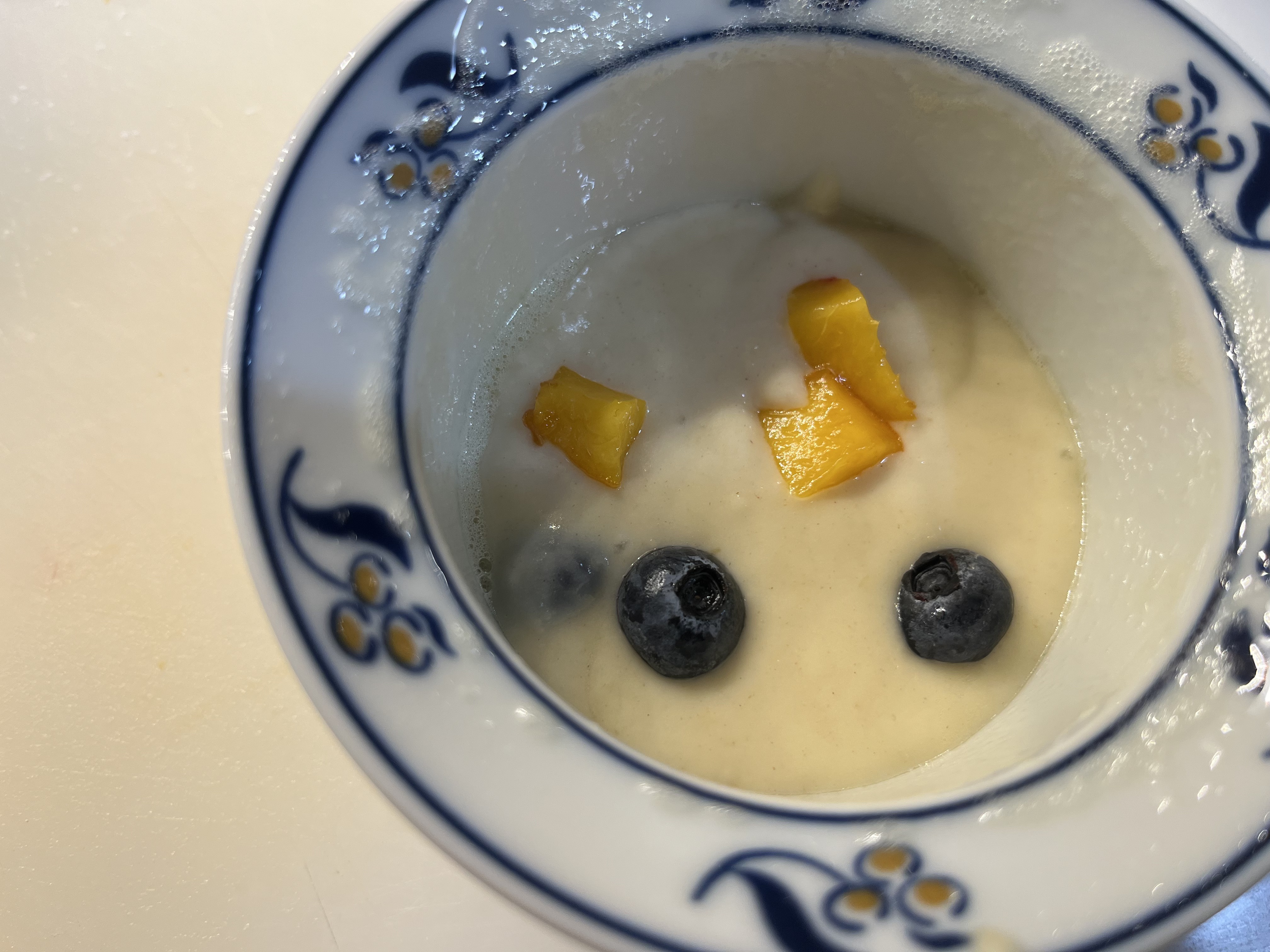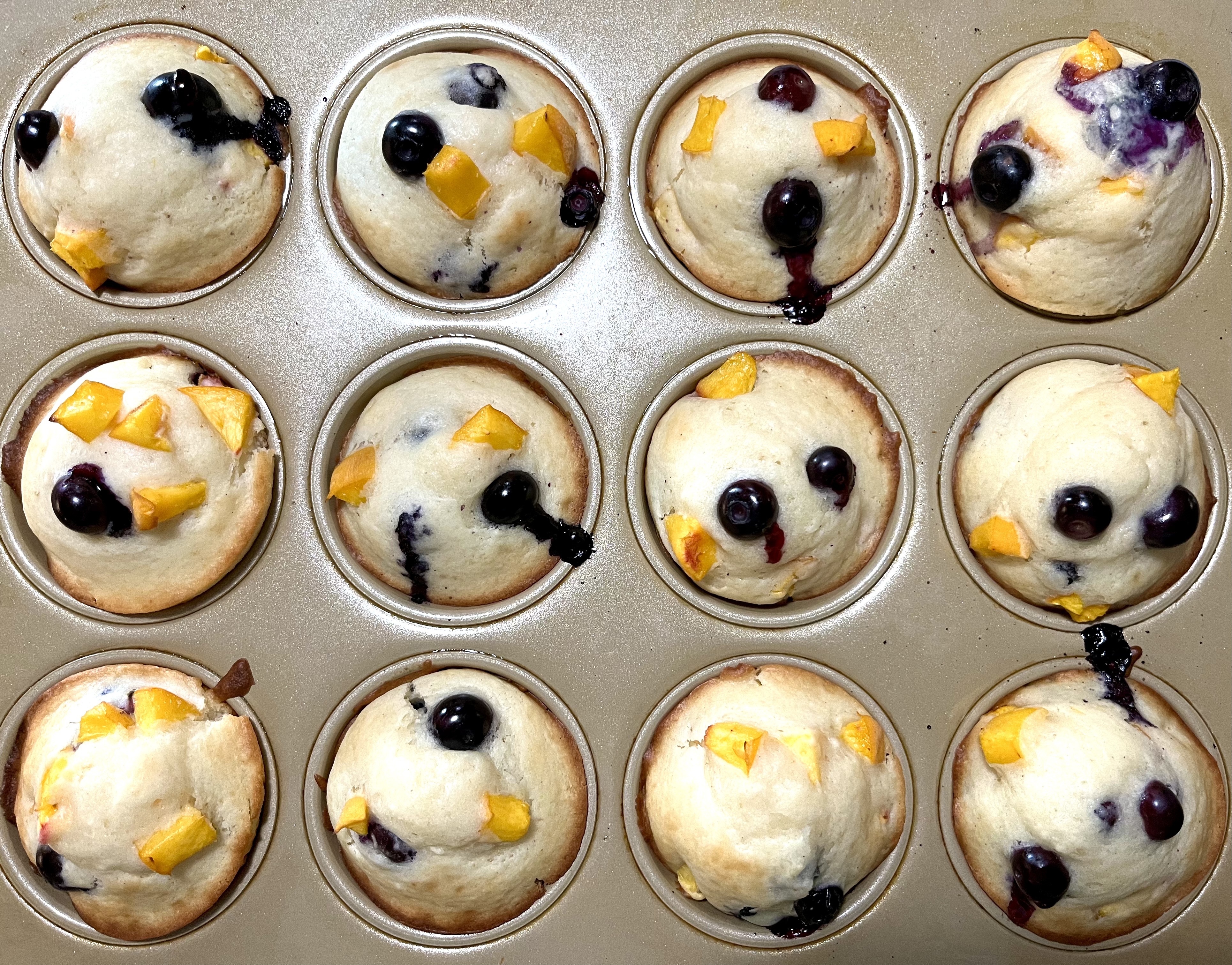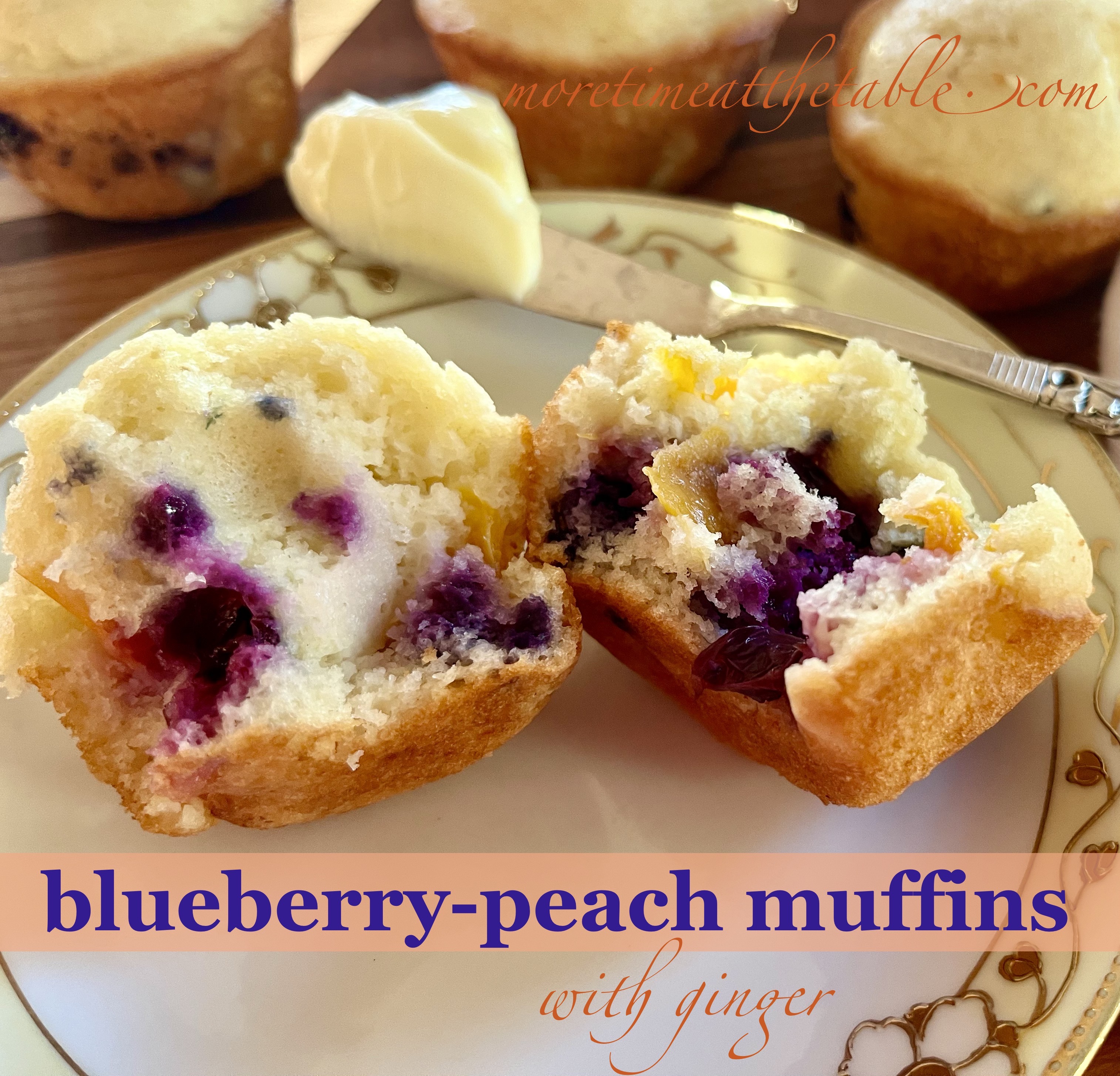 I do nearly always have fresh blueberries and, if not, there’s a bag of frozen ones in the freezer waiting my measuring cup. (When they’re the best and the cheapest and come from the Pacific Northwest, I freeze a bunch.) The other day, I had Palisades peaches (known to the rest of the country as “Colorado peaches”) over-ripening in my south window and not too awfully many blueberries. There was, I thought, just enough fruit for 12 muffins if I combined the two. And what if I stirred in a little fresh ginger for spicy interest? Turned out to be a perfect match made right here on the mesa in Colorado Springs.