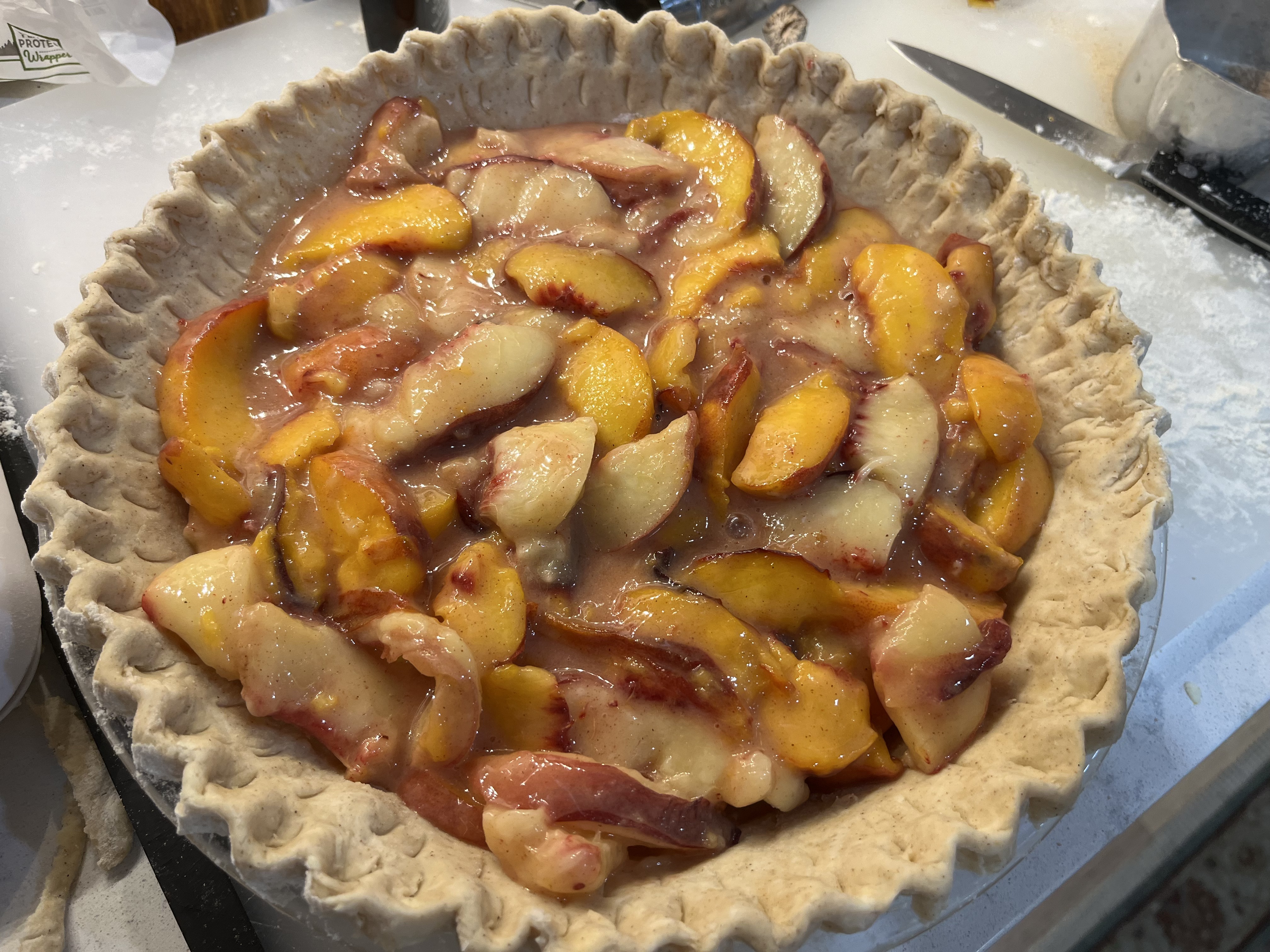 HOW RIPE SHOULD MY PEACHES BE? Overly-ripe peaches will bake into a good pie; there’s no reason not to use them. I used them here. But just-ripe peaches will bake into an even better and more attractive pie, holding their shape within the crust. While I’m fond of sliced peaches, some bakers instead prefer peach chunks. Cut each pitted peach into thirds and cut each third into three more pieces.
