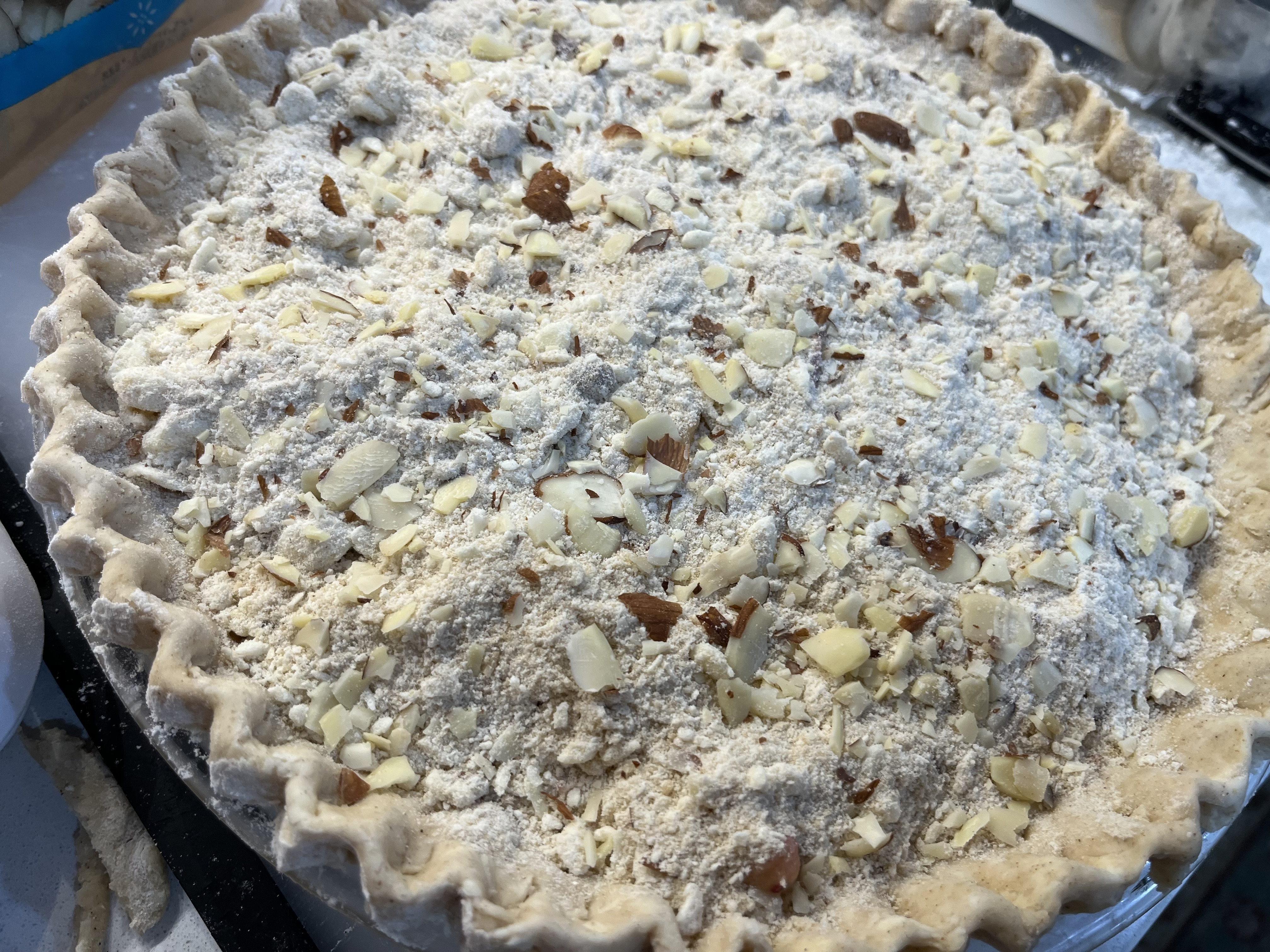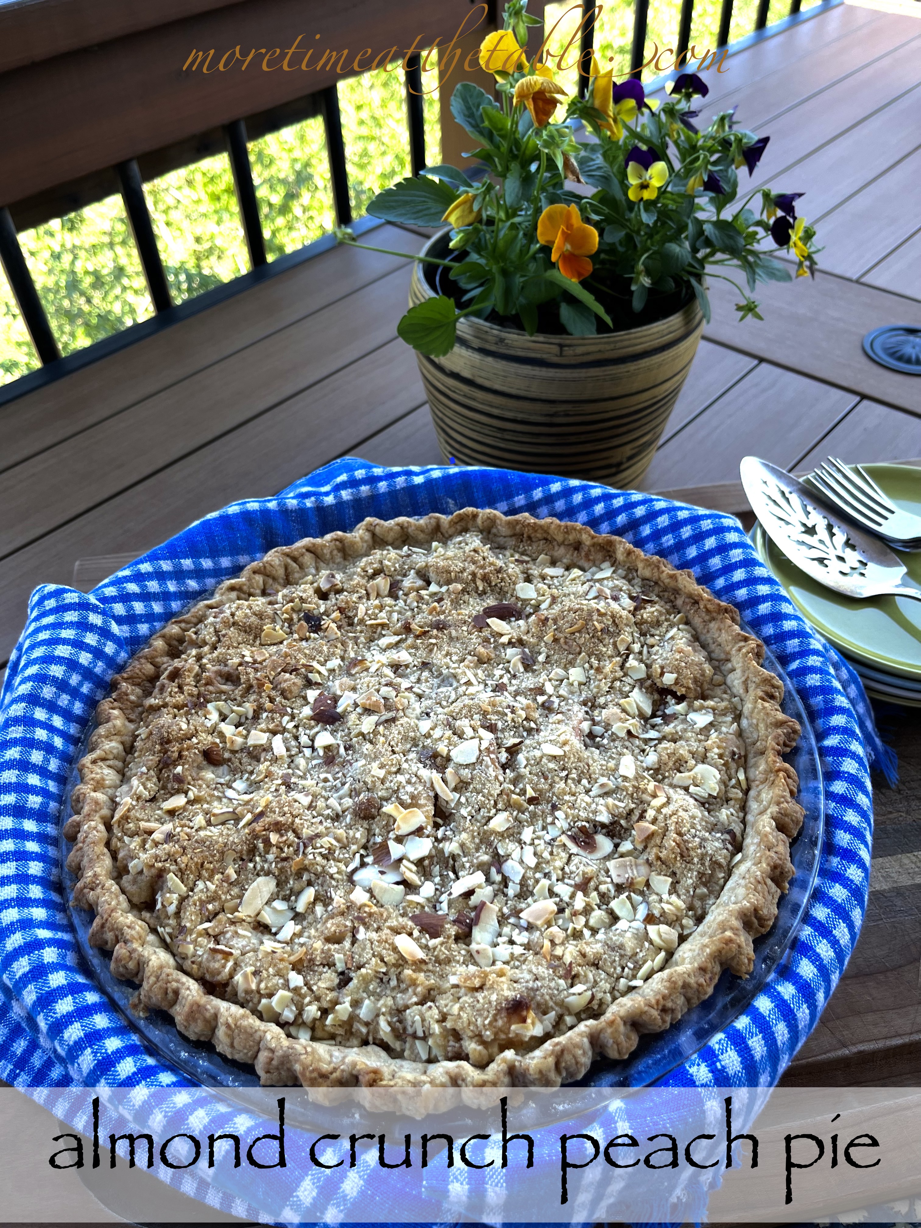 - ADD FILLING TO THE PASTRY IN THE PIE PLATE: Spoon the peach filling evenly into the pastry-lined pie plate. Sprinkle the almond crunch topping evenly over the filling. Crumble the additional two tablespoons of sliced almonds a little in your fingers and sprinkle them over the almond crunch topping. Place pie on the rimmed baking sheet.NOTE: For fluted edged pies, it helps (though isn't absolutely necessary) to stick the pie in the freezer for about 20 minutes here. The colder the dough, the more likely your fluting will not spread during baking and you'll have a prettier pie.