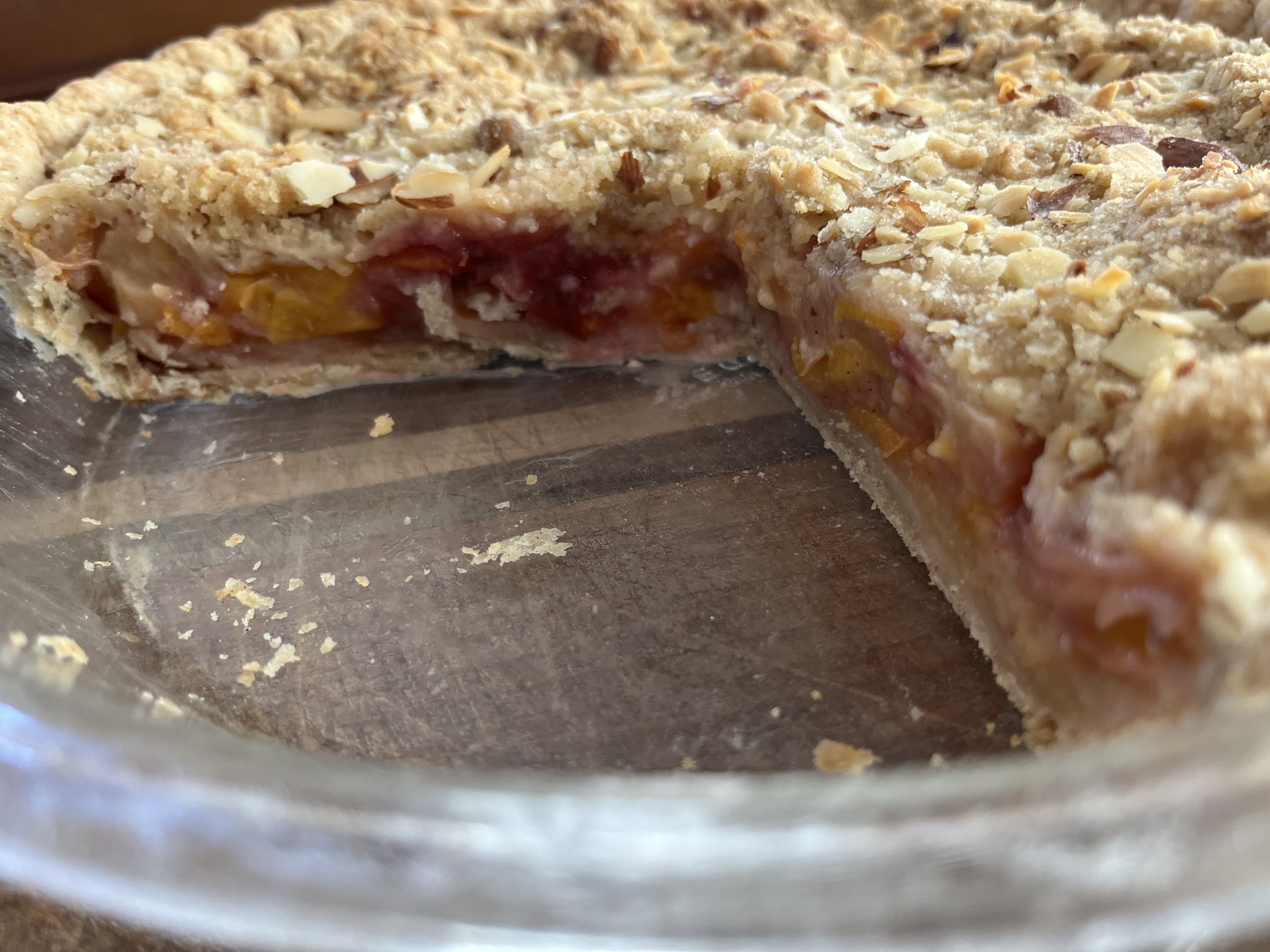 Living in Colorado, I skew up my annual late-August Palisades peach pie just a tinge. There’s peach-blueberry; brown sugar peach pie; peach cobbler (well, it’s pie-ish); some sort of crisp; and so on and so forth. This year, I had to have a crumb topping because… I don’t know. But not just any crumb topping; I wanted an almond crumb topping with the almond note repeated in the peach filling so that you had that perfect complete almond thrill in each and every bite. I love almonds– and peaches and almonds are related, you know. So now you have an Almond Crunch Peach Pie. Just for you.