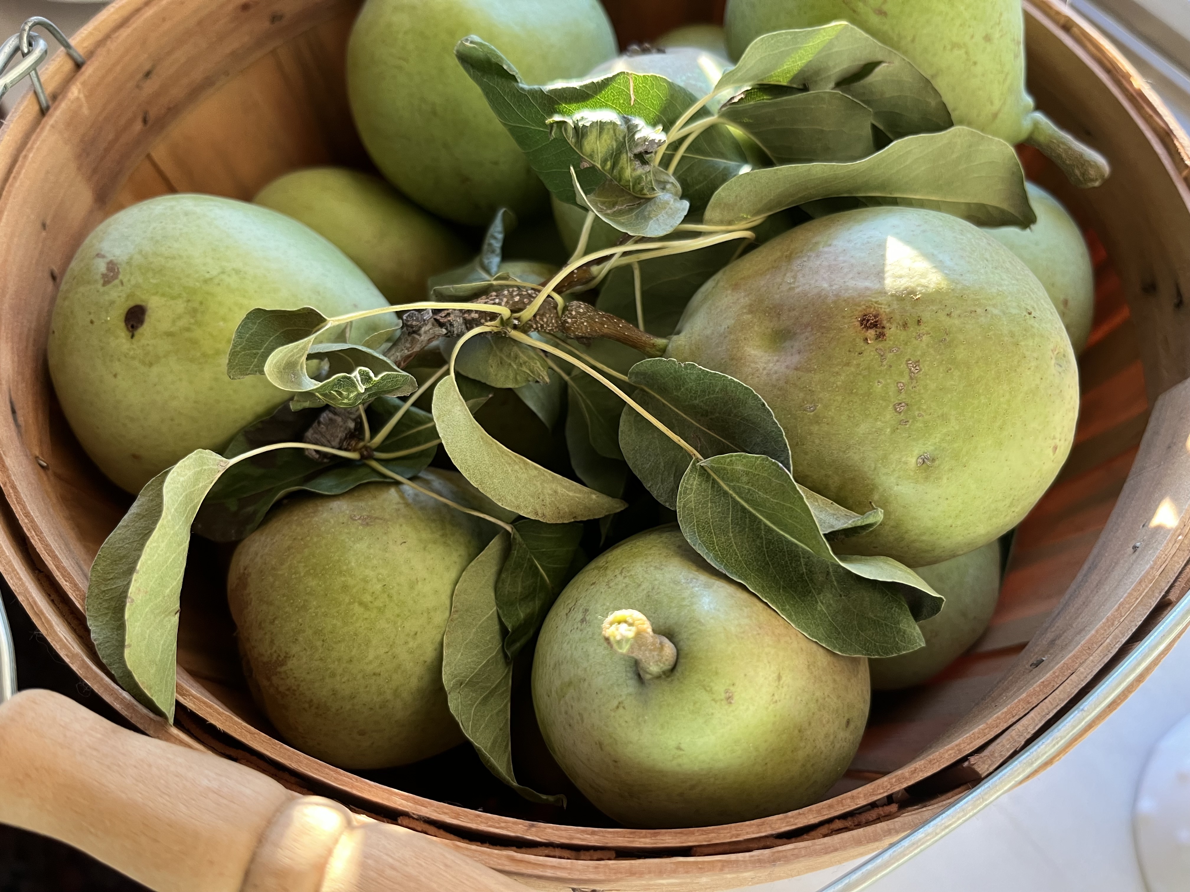 Old friend and longtime blog follower, Jan Moore, gifted me a basket of gorgeous green pears this week. I’ll store them in my garage fridge and dream about what to do with them. I’ll take out a few at a time to ripen in my sunny south window and if they last, I’ll use a couple to make my Apple-Pear-Cranberry Pie (or coffeecake) in the fall. Thanks, Jan!