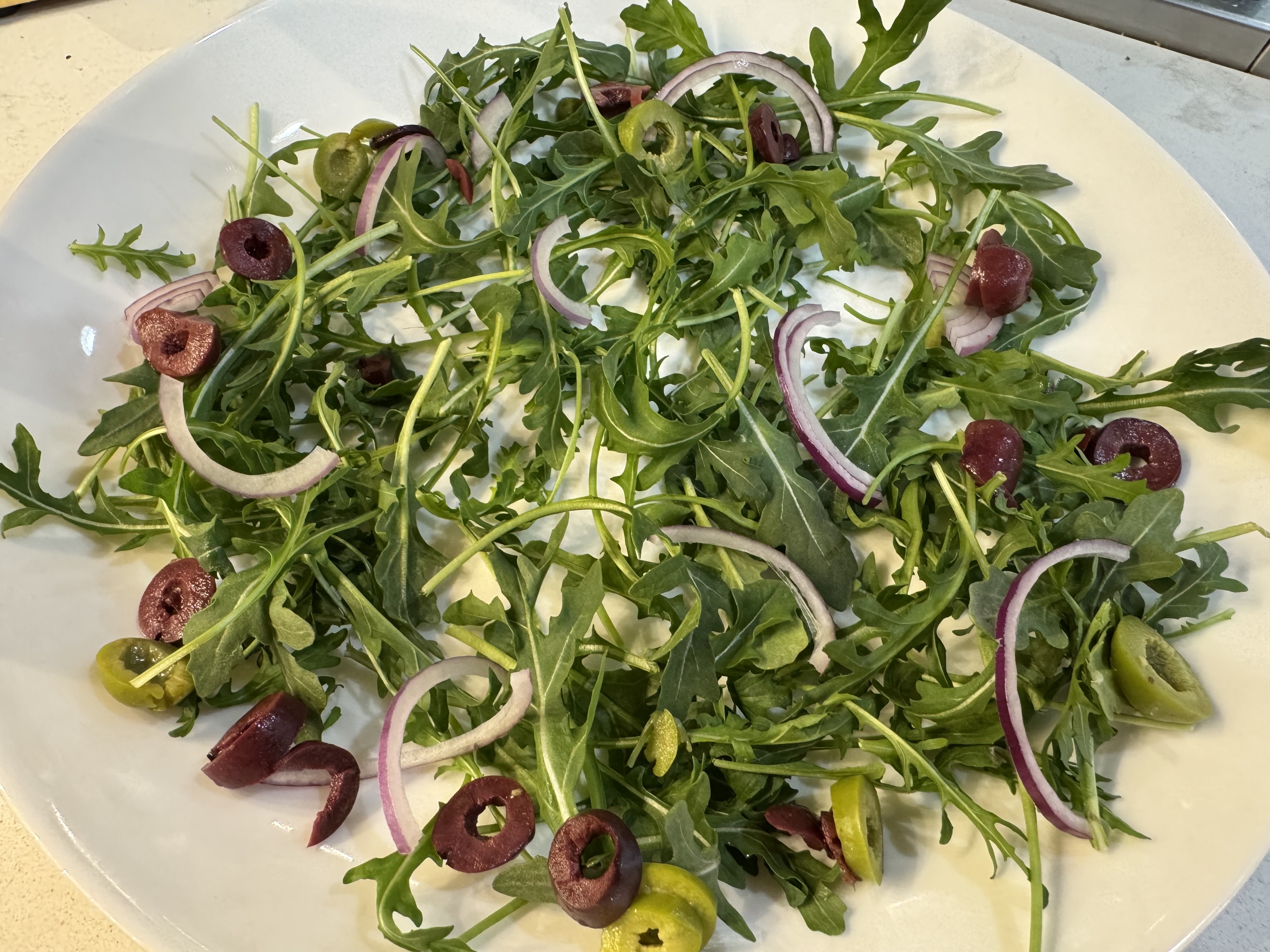 - Divide the arugula between two medium, chilled shallow bowls. Sprinkle with salt, pepper, and a pinch of crushed red pepper.