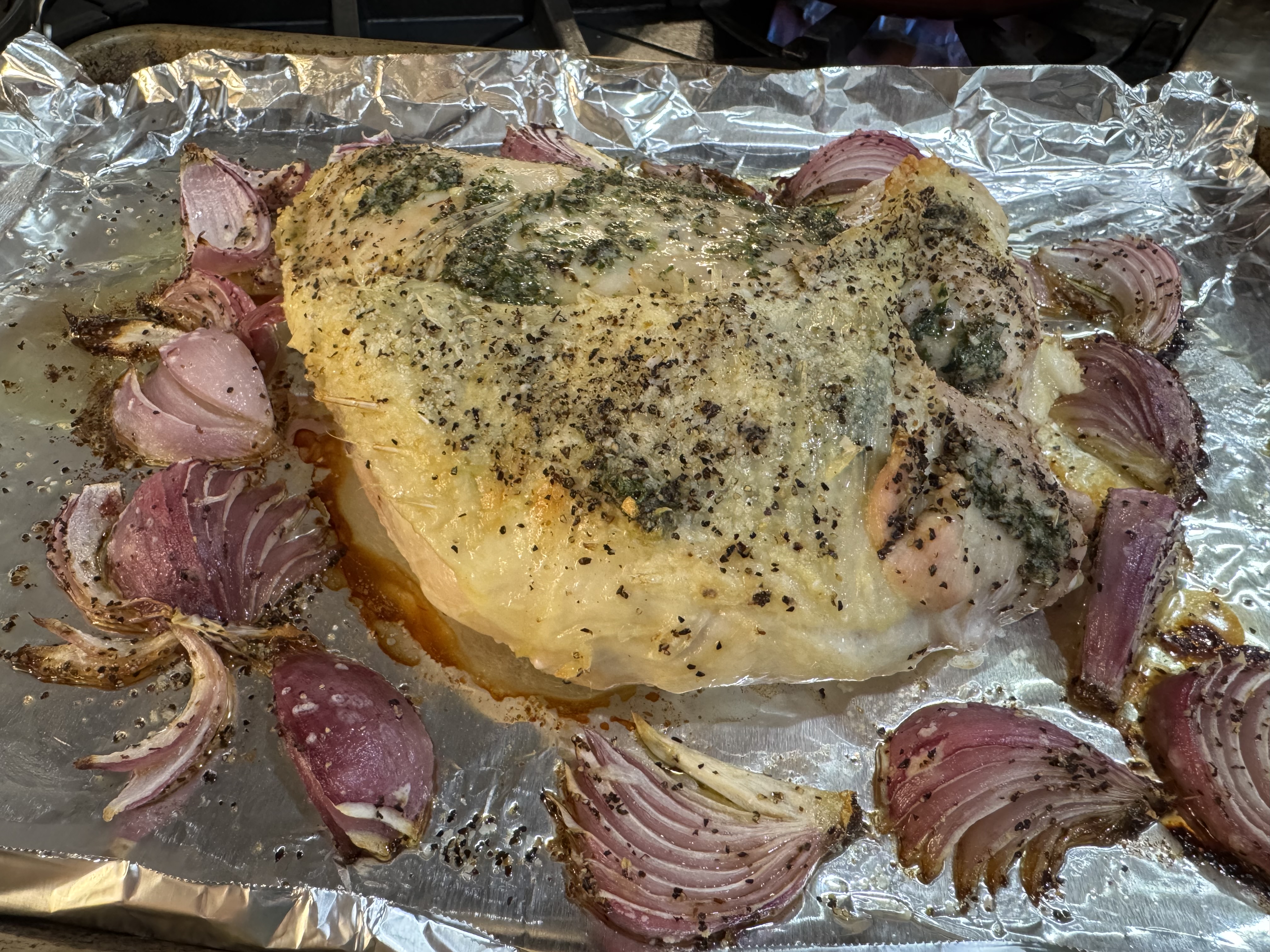 Tired of chicken? Here’s something I just made: FRESH HERBED-BUTTER TURKEY BREAST. Trader Joe’s sells a fresh, Kosher half-turkey breast (Empire brand) for $12-$14. I mashed 4 tablespoons soft butter, a minced garlic clove, 1/4 teaspoon each salt and pepper, and a couple tablespoons of fresh herbs (I used sage and parsley.) together and stuffed that under the skin. Salted and peppered the whole thing and roasted it with olive oil-tossed red onion cut into eighths at 325 F for about 45 min. when an instant read thermometer registered 165F. Covered and rested 15 min before slicing. Lovely with a salad or sweet potatoes or… Leftovers for turkey tacos with blue cheese, turkey-noodle soup or, of course, the quintessential turkey sandwiches! Bad photo. Good food. (Why buy kosher if you’re not a Jew? Kosher poultry is humanely raised and of excellent quality. No hormones, artificial ingredients, etc. For me, it’s the fresh label that does it. My regular grocery typically sells only frozen whole turkey breasts.)