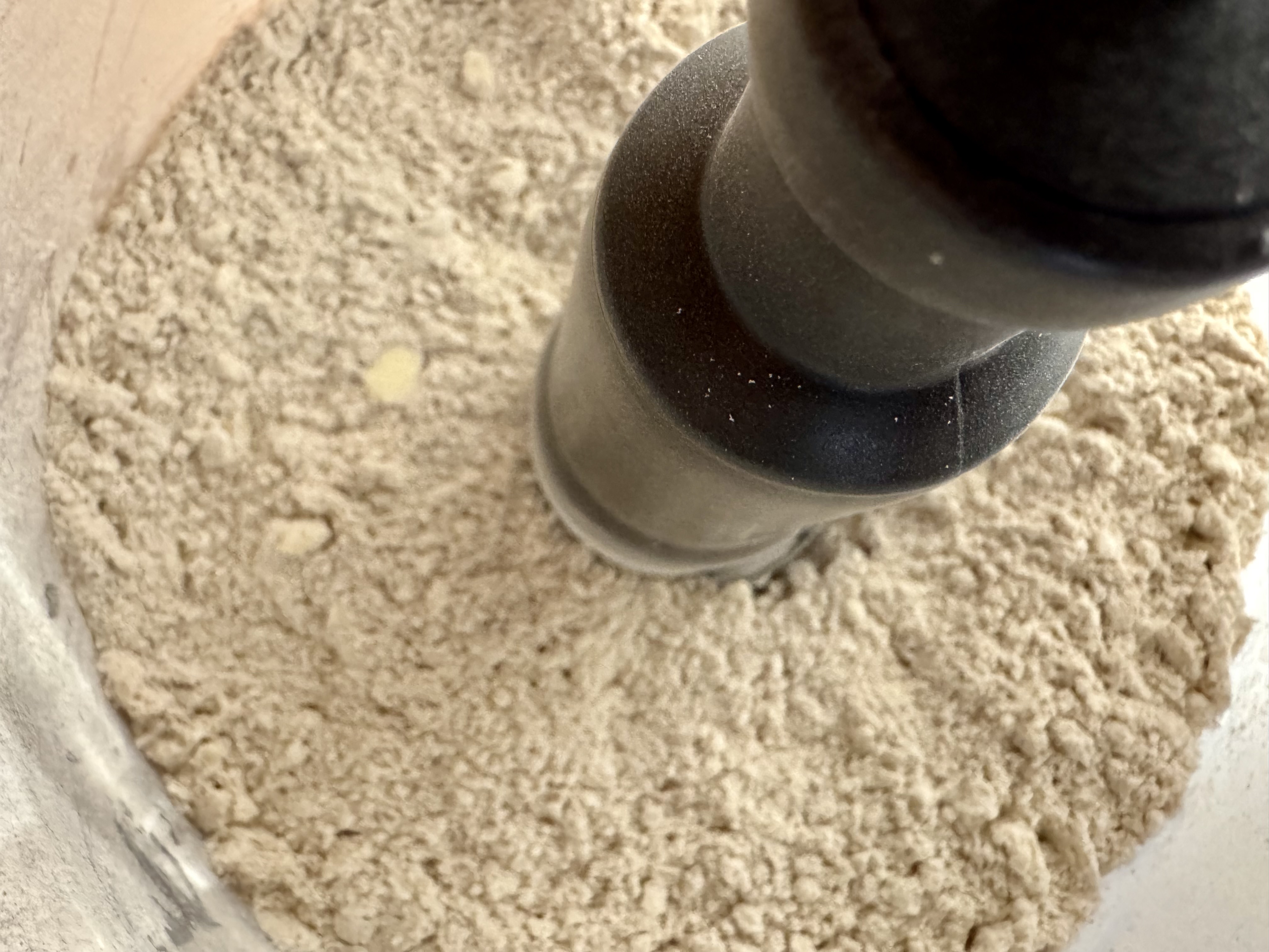 - MIX DRY INGREDIENTS + CUT IN BUTTER: In the bowl of a food processor fitted with a steel blade, pulse or mix the flours, baking powder, baking soda, sugar, salt, cayenne, garlic, and dill weed. Add the butter and pulse carefully until you have pea-sized and smaller pieces of butter.