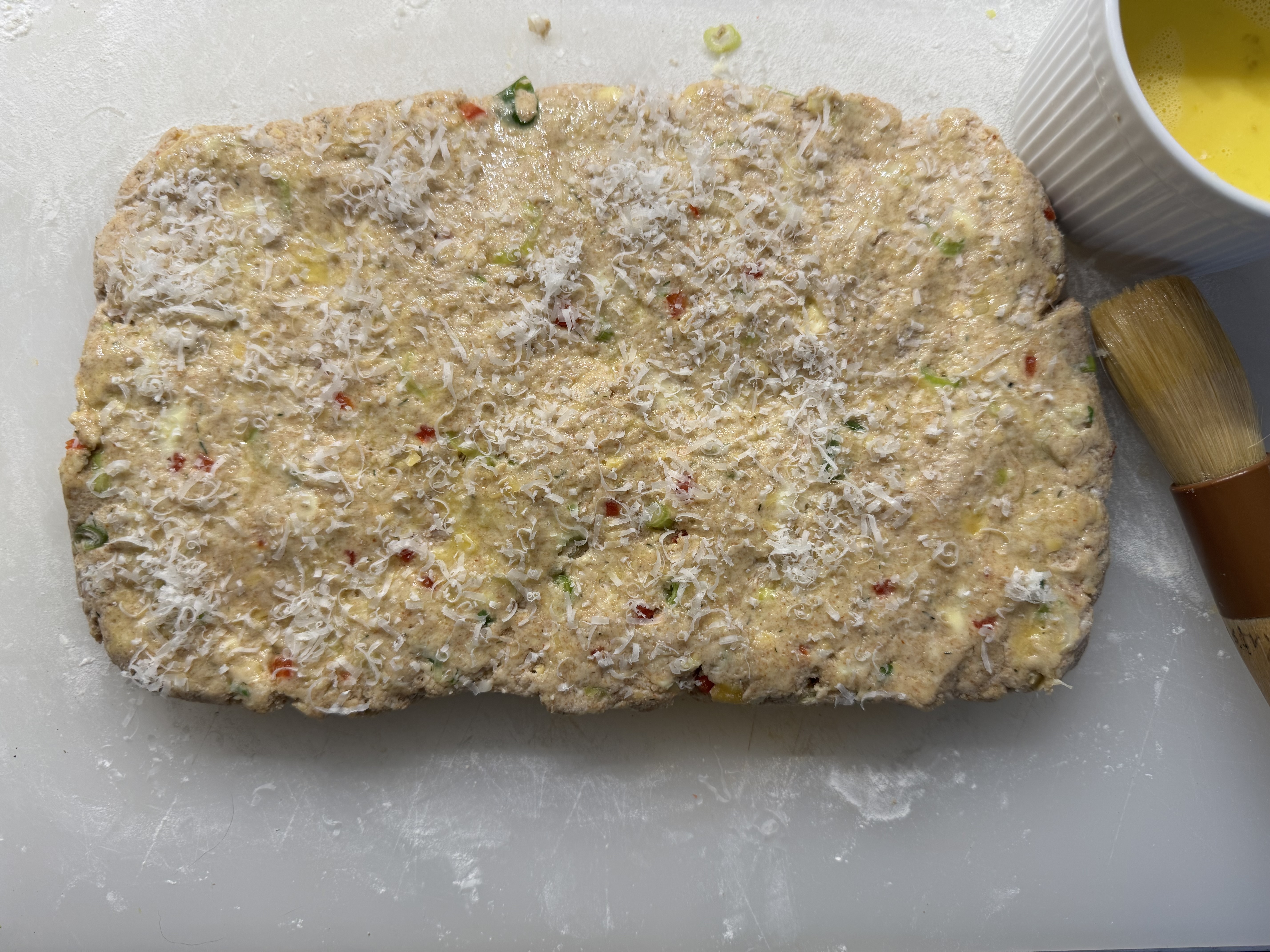 - TRANSFER THE DOUGH ONTO A FLOURED COUNTER OR BOARD and gently pat the dough with floured hands into an approximately 6”x10”x1” rectangle. The dough won’t be smooth or uniform. Brush it with about a tablespoon of the beaten egg. (Cook the rest of the egg for the dog or you or save for another use.) Sprinkle with the Parmigiano-Reggiano. Using a bench scraper or knife, cut the dough into first 4, then 8, then 16 squares or logs. Place scones on lined baking sheet. (You can cover tightly with foil and freeze them for up to 2 months at this point. Remove from freezer, uncover, and follow directions below, baking for a couple of extra minutes.)