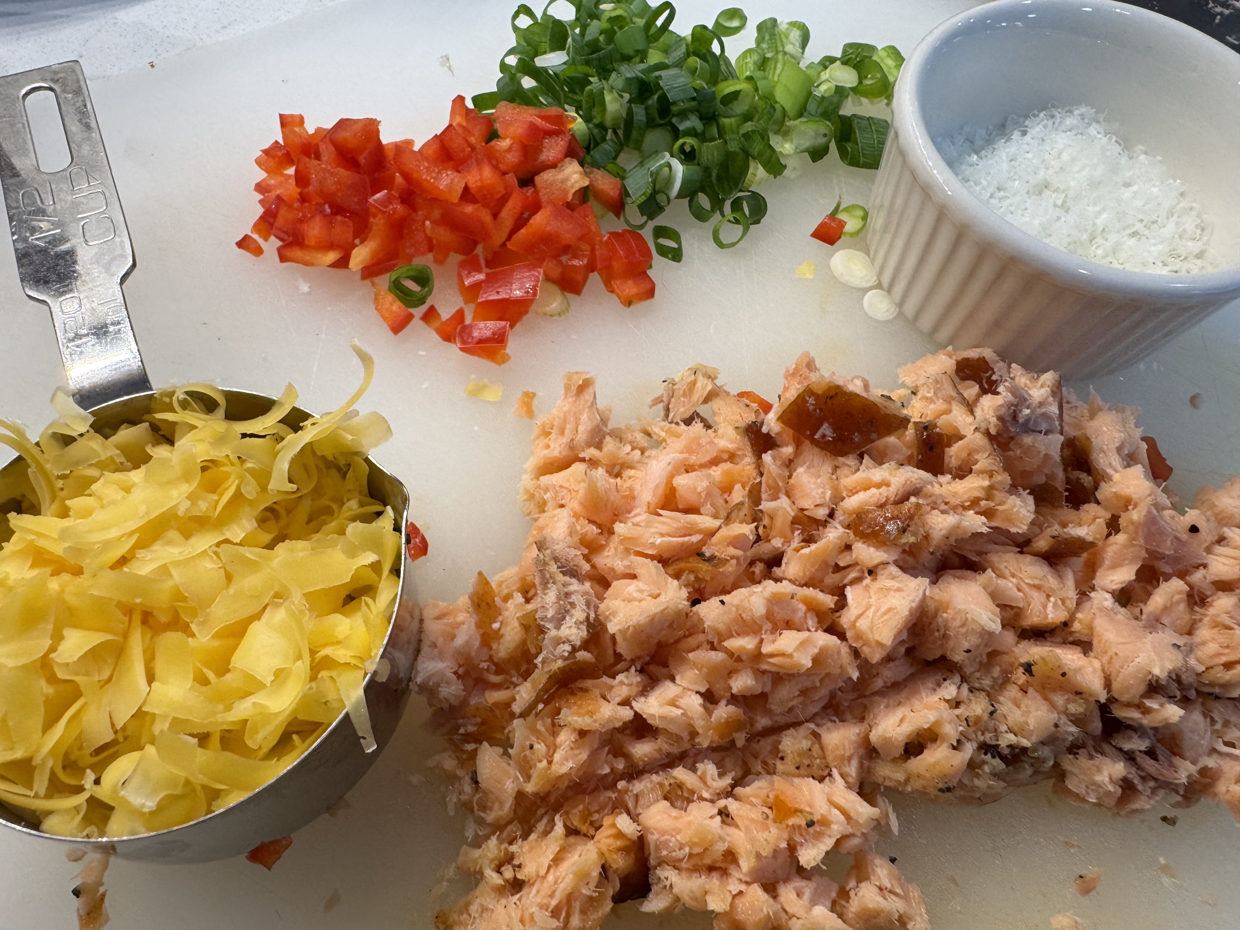 CHANGE IT UP: Flours: use all unbleached, all-purpose flour if that’s what you have. Salmon: grilled or roasted salmon can sit in for smoked salmon. Cheeses: Other grated cheeses like Swiss, Gouda, Colby, or Havarti can be used in place of Cheddar. Pecorino Romano or Manchego might do instead of Parmigiano-Reggiano. Any minced onion can replace the scallions or try minced chives. In a pinch, if you’re out of buttermilk, add a teaspoon or two of lemon juice or white vinegar to regular cow’s milk and let it rest 10 minutes before using.