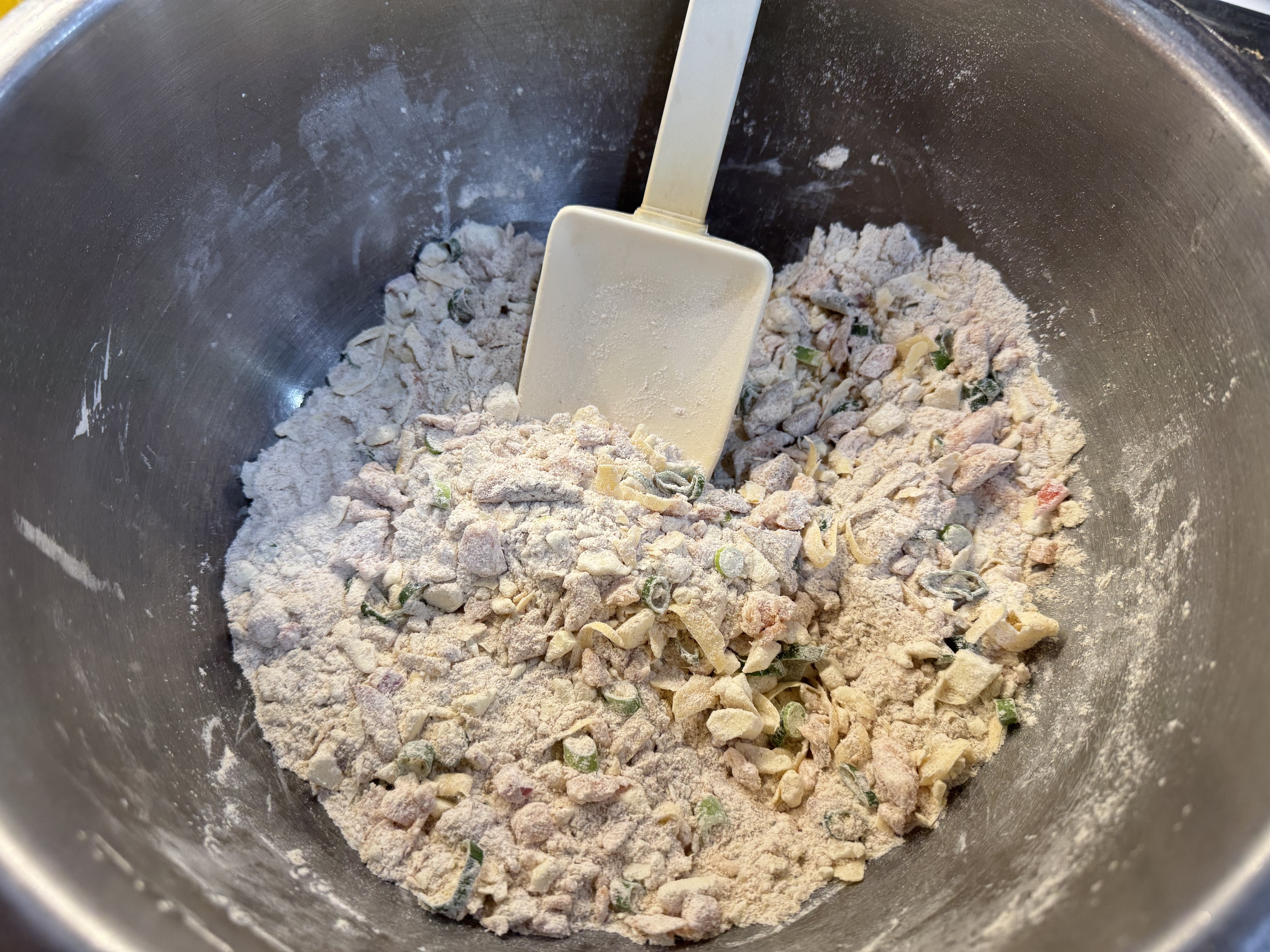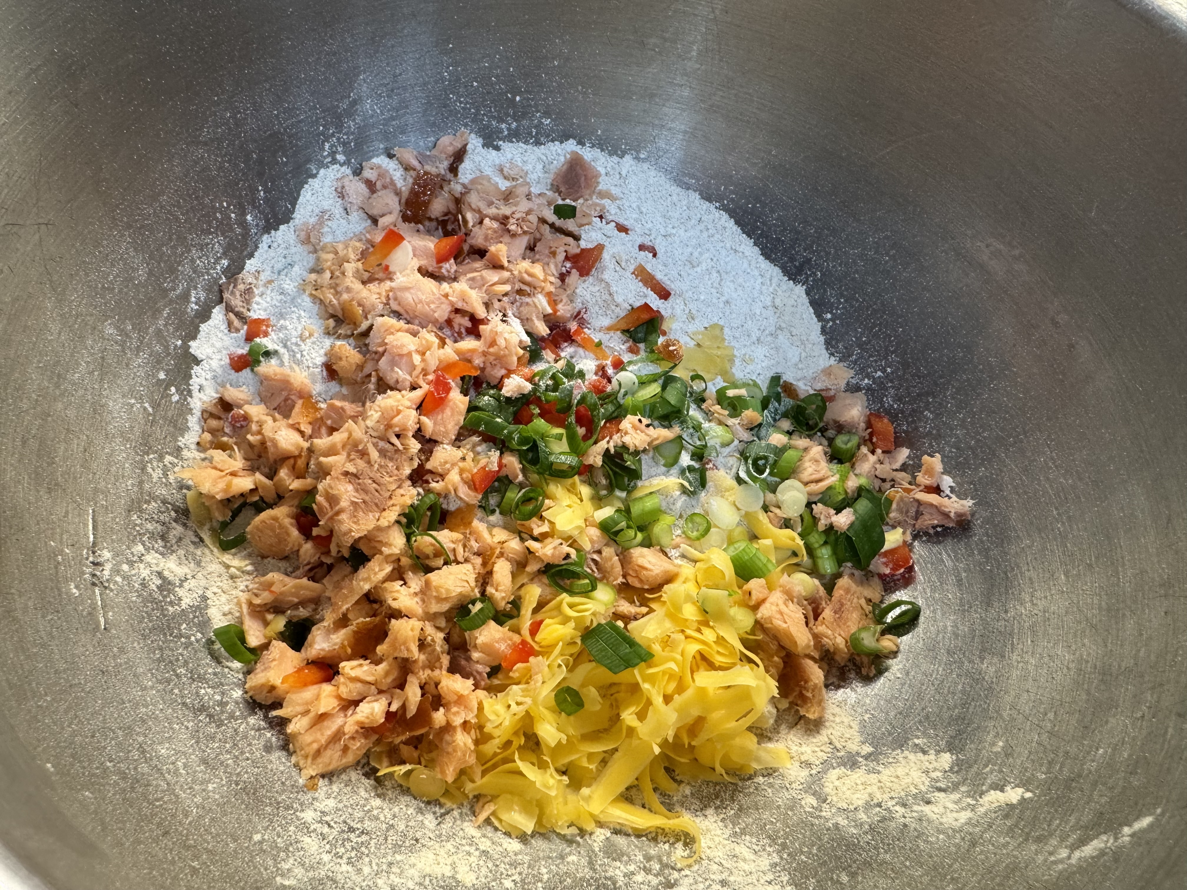 - TURN OUT INTO LARGE BOWL, MIX IN CHEESE/VEGGIES/SALMON; ADD BUTTERMILK: Turn flour mixture out into a large bowl and stir in the Cheddar cheese, scallions, red bell pepper, and the salmon. Pour the buttermilk over the flour mixture and, using a table fork, mix and stir until all the dry bits are incorporated. If the dough feels dry, add another tablespoon or two of buttermilk. If too wet, add a tablespoon or two of flour. Using your hands, knead and/or gather the dough just until it just holds together in somewhat of a ball shape. Don't overwork the dough.