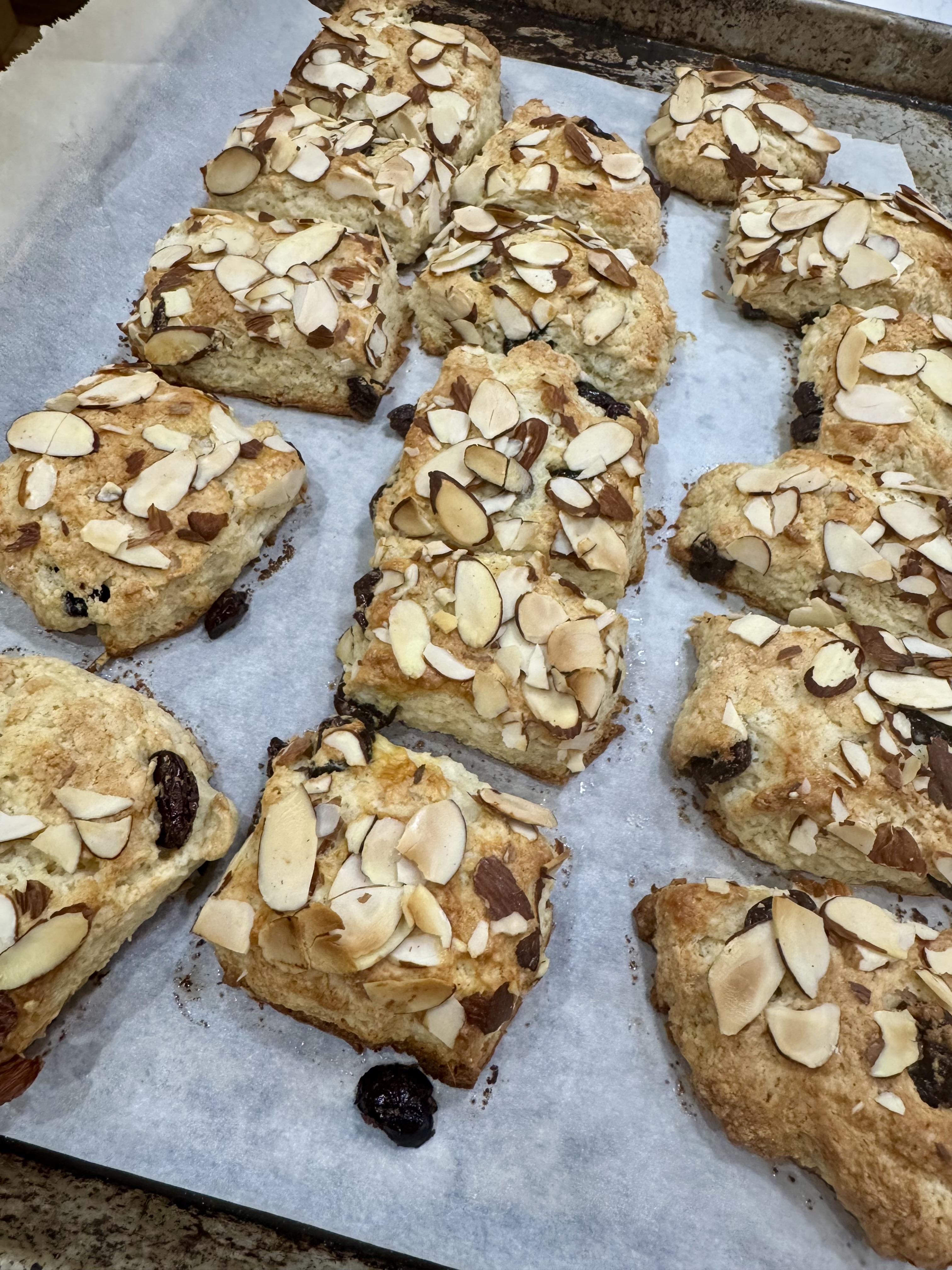 Sweet thanks to baking gurus Dorie Greenspan and Sue Lawrence, as well as others, for more than one idea about how to make and bake scones. Dorie’s directions for freezing dough and baking later are incorporated into this recipe.