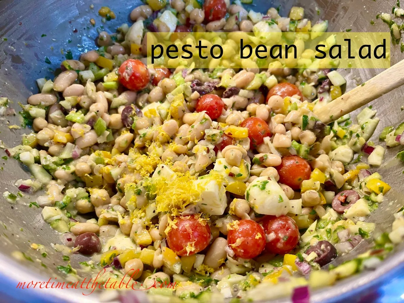 CHANGE IT UP: The beauty of a bean salad–besides its quick nature– is its innate versatility. Choose your beans (cannellini, black, pinto, etc.) and add other suitable ingredients. Example: cannellini beans might like a basil vinaigrette, sun-dried tomatoes, black olives, cherry tomatoes, marinated artichoke hearts, Parmigiano-Reggiano shards, etc. Pinto beans could be happy with pickled jalapeños, a cilantro vinaigrette, roasted diced chiles, grilled corn, white onion, avocado, and cotija cheese. Like the chickpea idea but not my vegetable choices? There’s no reason to not toss in your favorite chopped grilled asparagus or green beans, diced cucumber, small pieces of broccoli or cauliflower or some veg you’ve got sadly lingering in your fridge. As noted in the recipe, you can choose your favorite small pasta or grab what’s on sale. No beans? Use a pound of pasta instead. This is, after all, your salad.