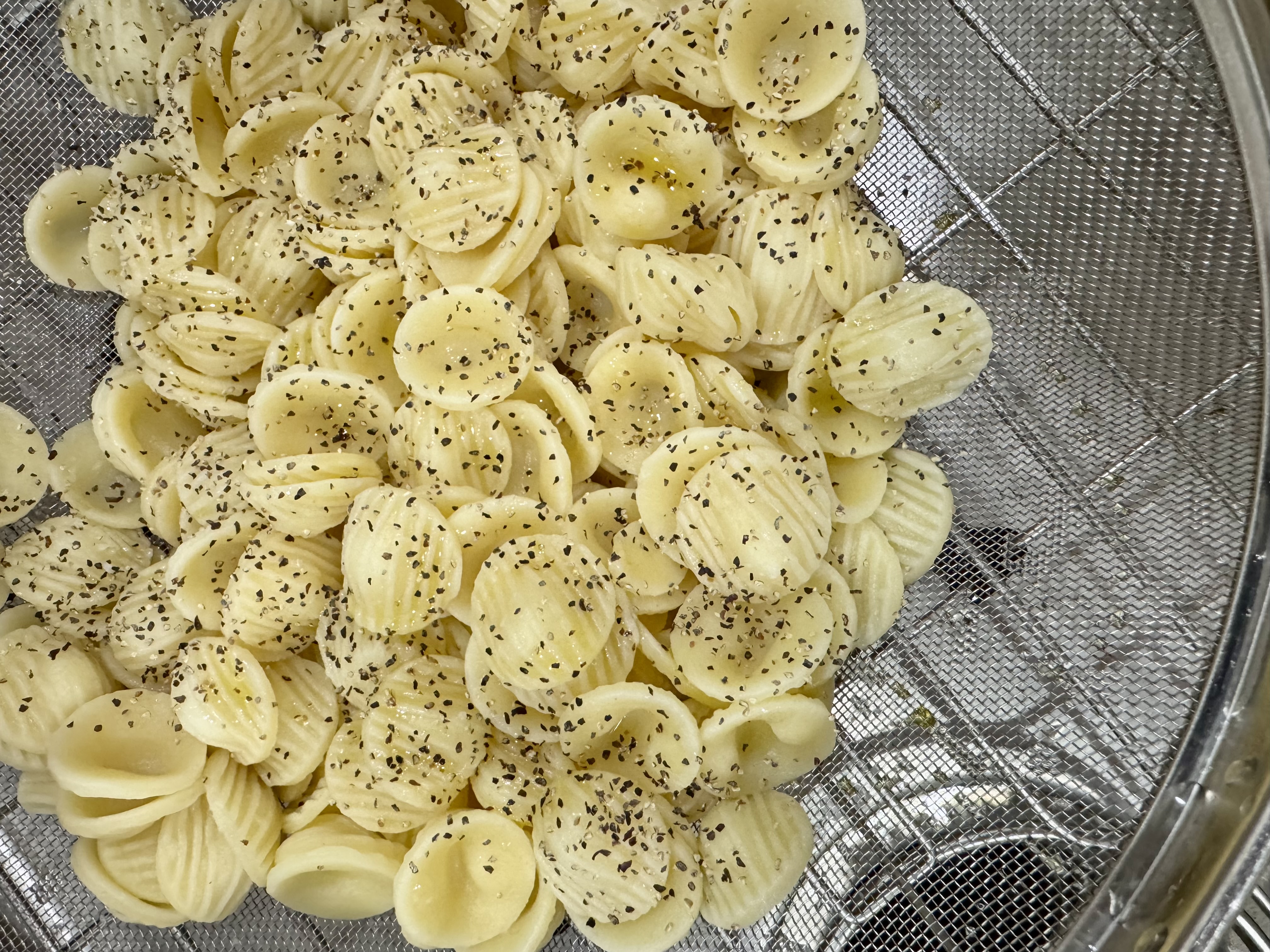 - 8 oz cooked and cooled small pasta – such as orecchiette, farfalle, elbows, or mini penne (Seasoned with a drizzle of olive oil and a pinch each salt and pepper while hot.)