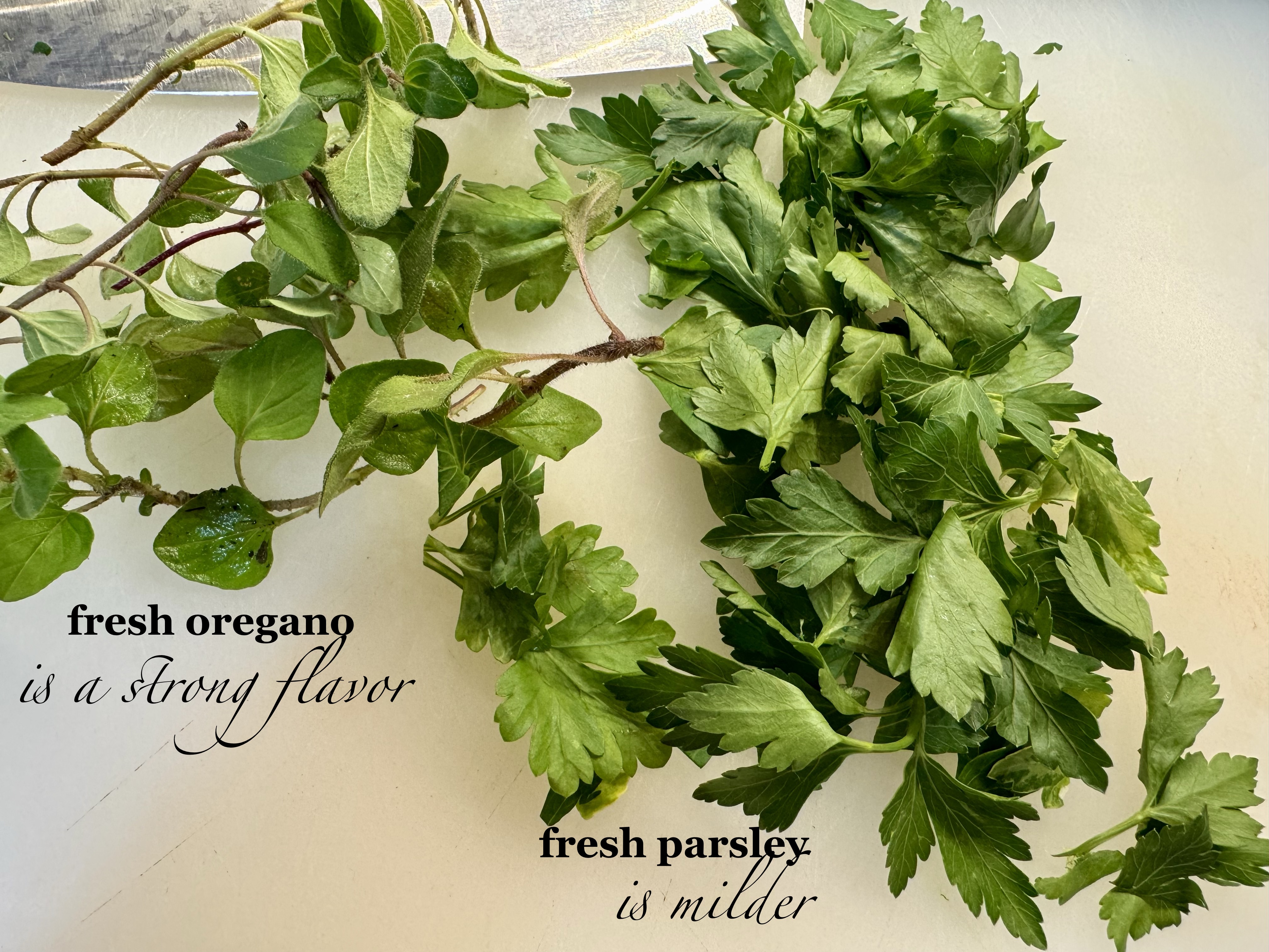 I have a beautiful herb garden, as well as herbs in pots, and love to make an herby vinaigrette. This salad features an oregano vinaigrette made with both oregano and parsley. If you’ve no fresh oregano, basil would do in its place and pairs well with parsley–your homegrown or the inexpensive grocery variety. In that case, you might ramp up the dried oregano in the salad. Extra parsley? Chop up the rest for your next green salad; you’ll be glad you did.