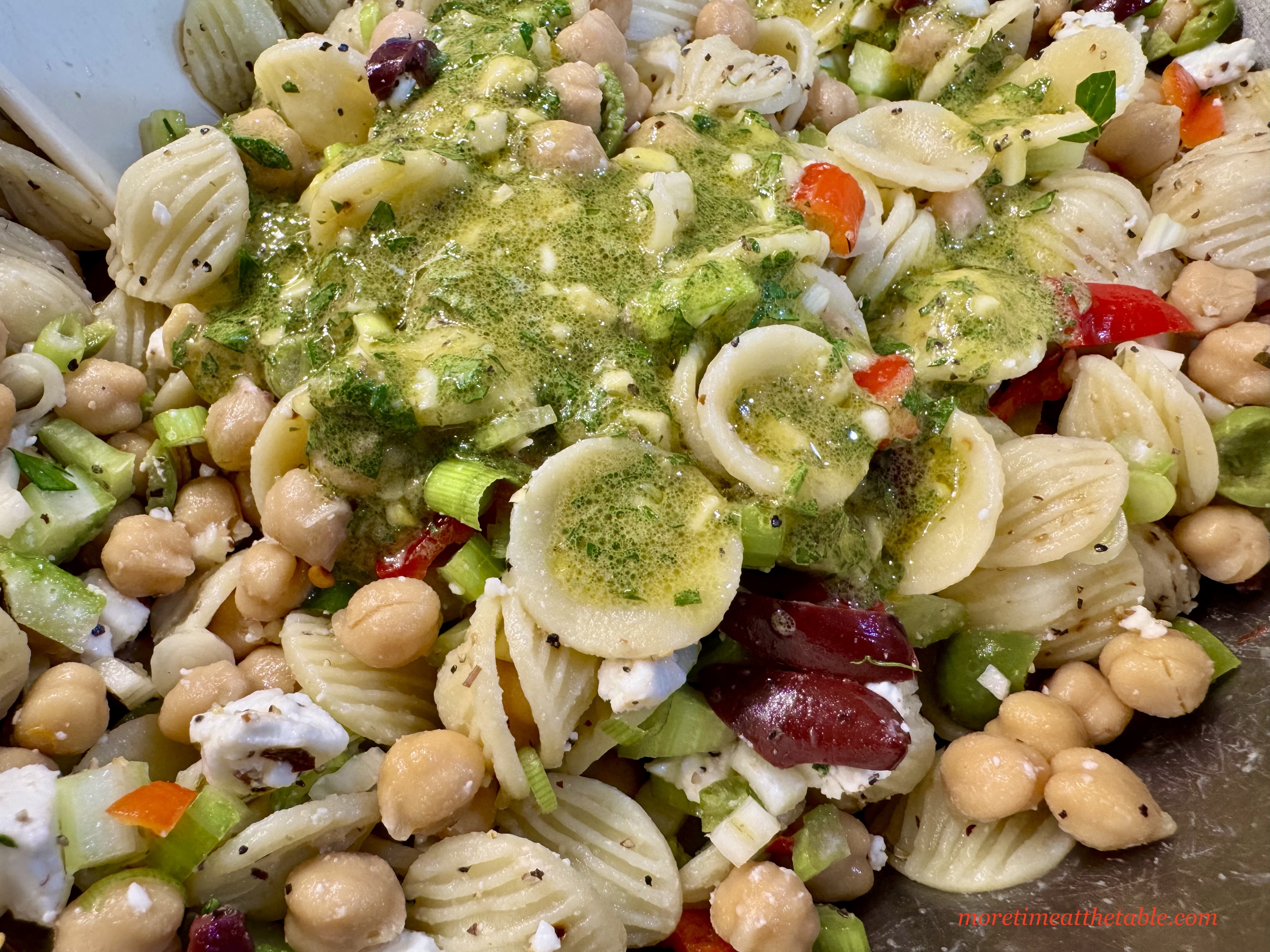 Because I keep a packed pantry, when I began to make this meal, all I had to do was chop a few vegetables, open two cans, and make a vinaigrette while the water came to a boil for the orecchiette (little ears) pasta. My shrimp was frozen, so –to save time and water– I fished out the pasta into a colander with a mesh skimmer, then tossed in the shrimp. By the time the water boiled again, the shrimp was done. There isn’t much faster than shrimp! You could skip that step if you buy cooked shrimp (COSTCO sells a nice container with sauce in its deli section), but do toss it with a little olive oil, salt, pepper, and maybe oregano before adding it to the salad.