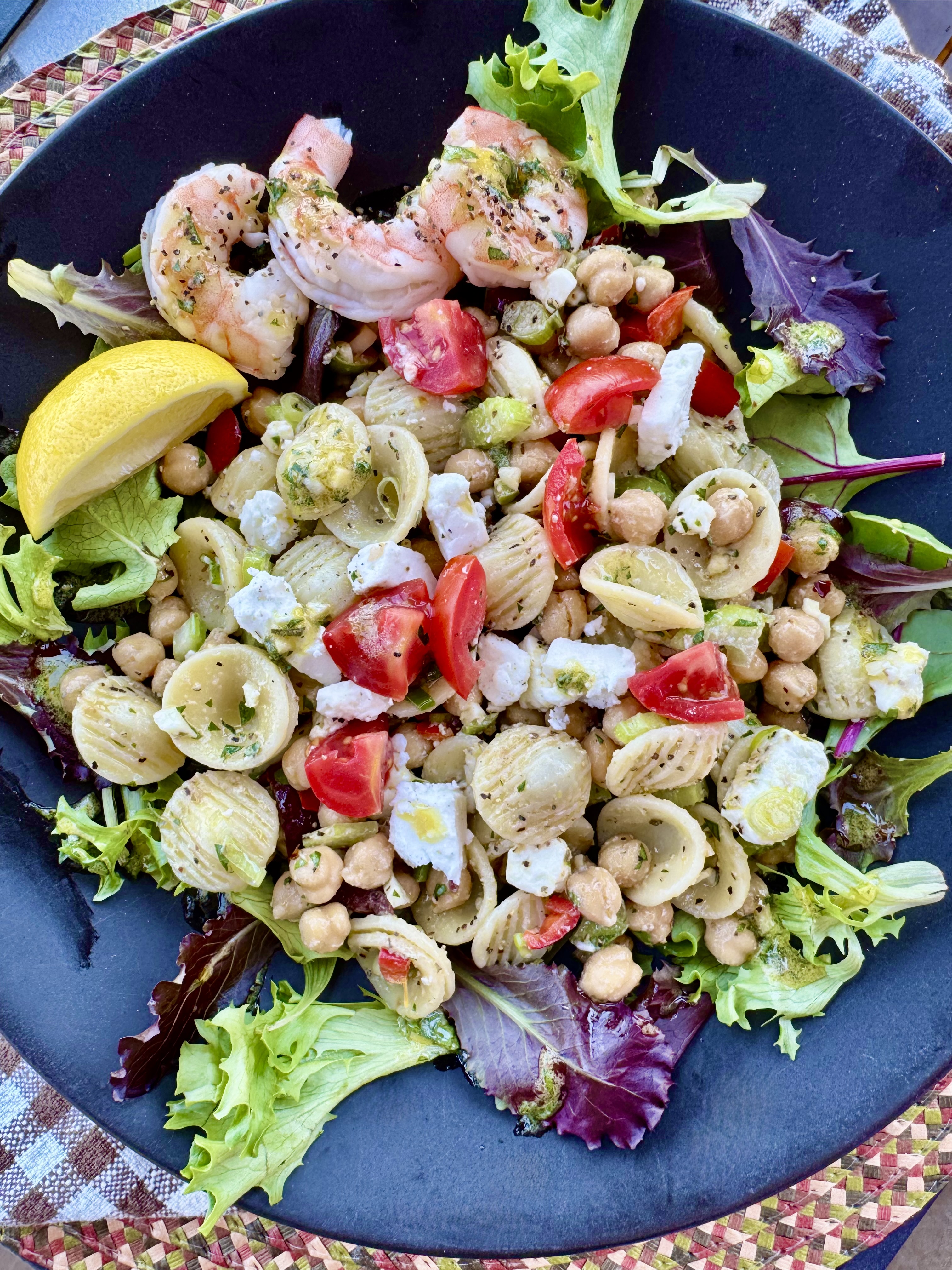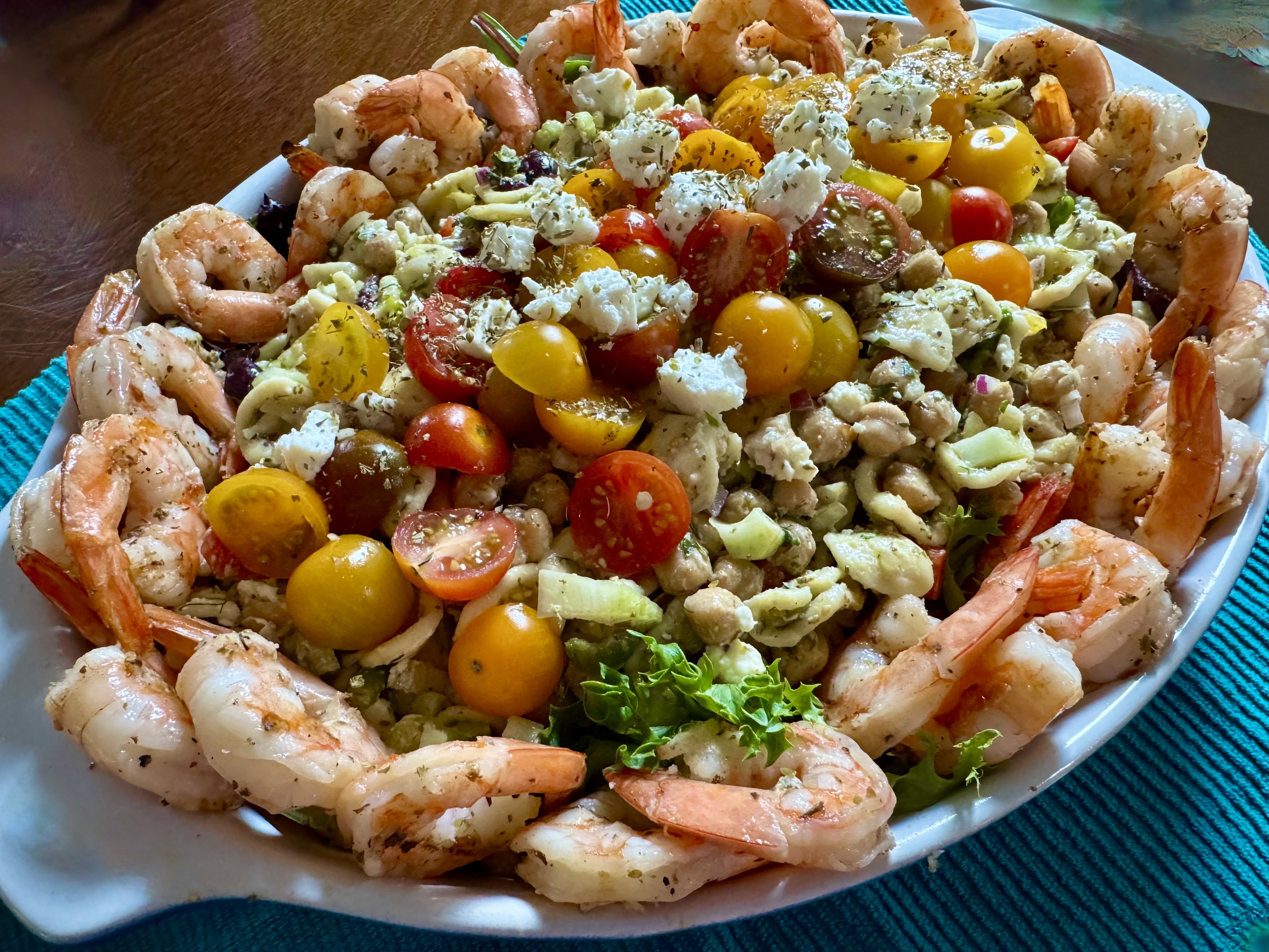 That reminds me...if you want a tastier salad of any kind: Season each ingredient as possible, just as I did the shrimp. For instance: When my pasta (cooked in salted water) is drained but still hot, I drizzle it lightly with olive oil and give it a pinch of salt and pepper. Do be careful about the salt here as 1. the pasta water is salty and 2. you’ll add salty feta later on.