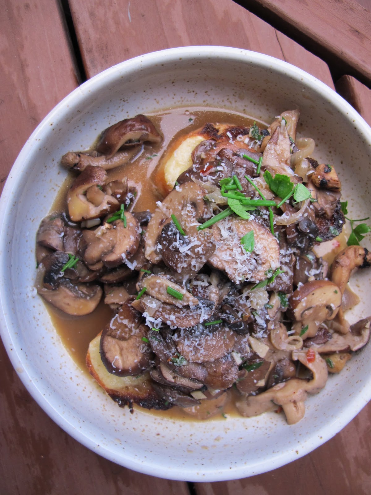 When I realized mushrooms were up next on our 39 Healthiest Ingredients, I began dreaming of cooking up a big pot of them with yummy fresh herbs, shallots, etc., and spooning that over toasted baguette pieces that were topped with Gruyère. Last night I stopped dreaming: