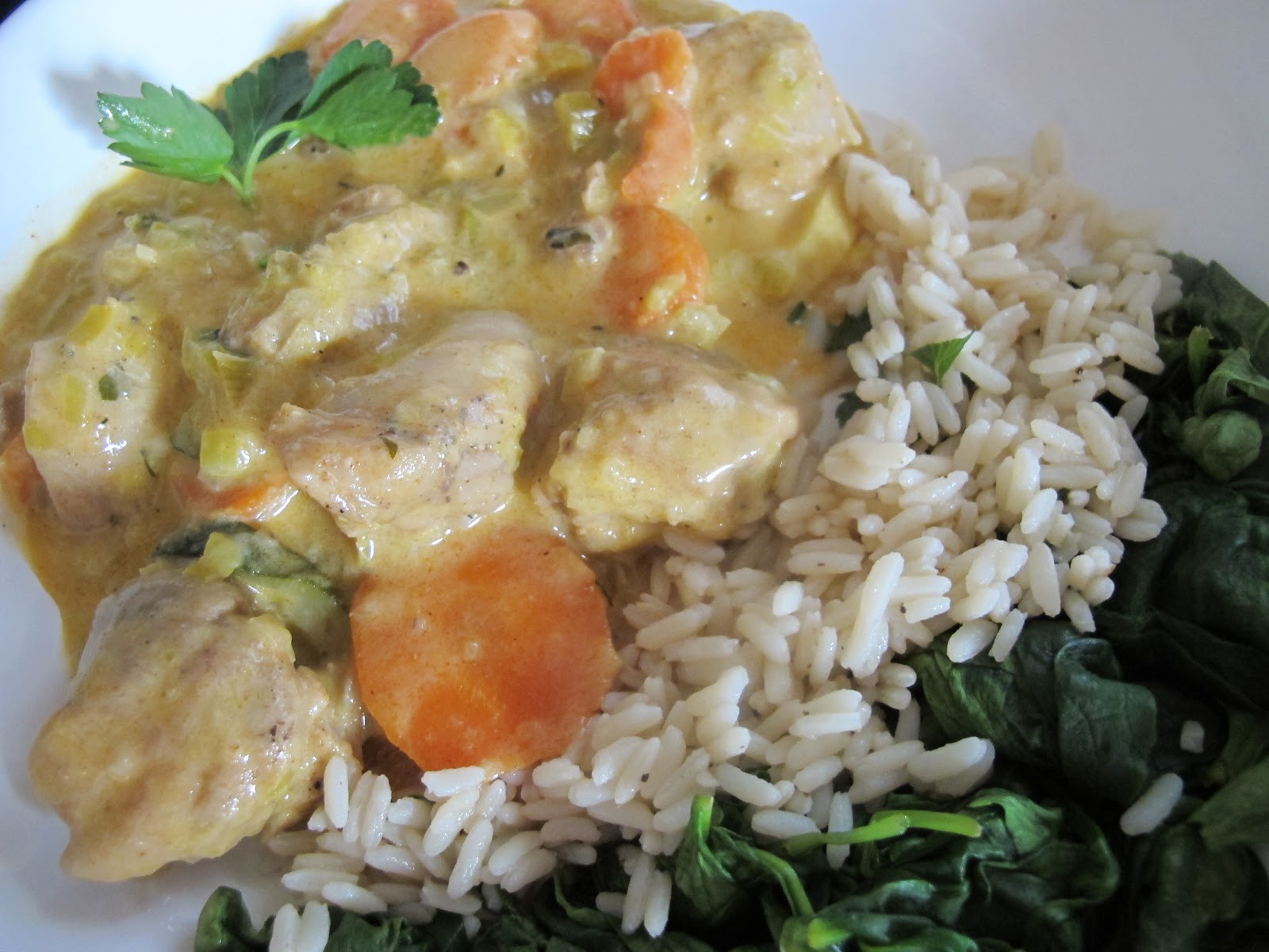 While I seldom blog recipes from other places, this easy chicken stew from Bon Appétit is luscious and makes a quick change from my typical winter beef or lamb stews. I’ve made it a time or two for friends, fixing it mostly beforehand, adding the cream right before serving. A scoop of rice and some fresh, sauteéd spinach make for a healthier and well-rounded meal and even lowers the price per serving. However, not to fear: this recipe uses inexpensive chicken thighs to start with.
