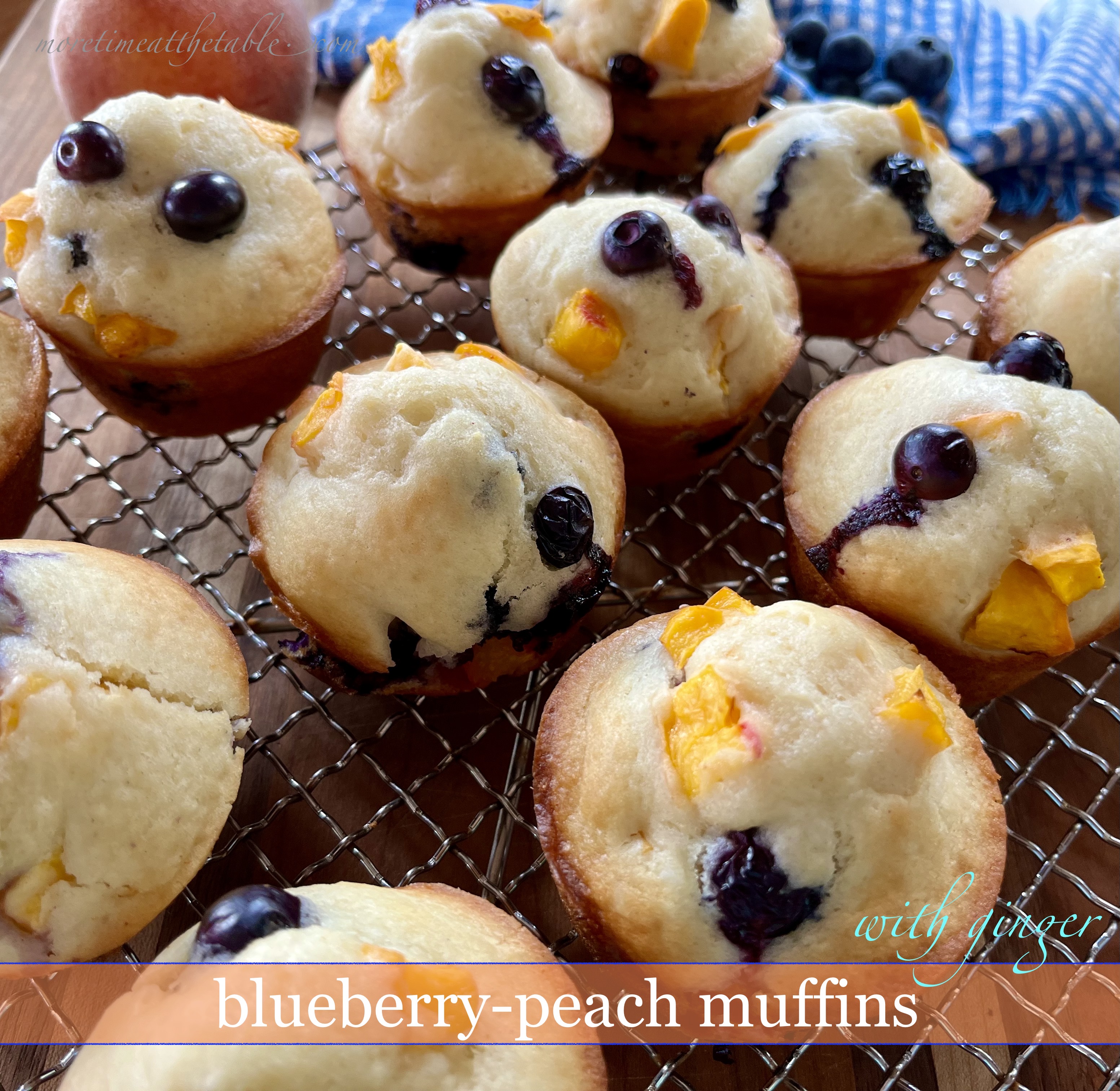 I do nearly always have fresh blueberries and, if not, there’s a bag of frozen ones in the freezer waiting my measuring cup. (When they’re the best and the cheapest and come from the Pacific Northwest, I freeze a bunch.) The other day, I had Palisades peaches (known to the rest of the country as “Colorado peaches”) over-ripening in my south window and not too awfully many blueberries. There was, I thought, just enough fruit for 12 muffins if I combined the two. And what if I stirred in a little fresh ginger for spicy interest? Turned out to be a perfect match made right here on the mesa in Colorado Springs.