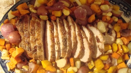 So, just for a fun change from my own kitchen’s recipes, here’s one I’ve adapted from CI, and hope you enjoy. A 3 or 3.5 pork pork loin feeds 6 generously and a 5 # roast feeds 8. I like to carve the loin, place it at the center of a large serving platter, and surround it with roasted vegetables. It can be placed at the center of the table or passed and everyone can help themselves.