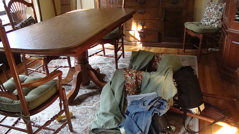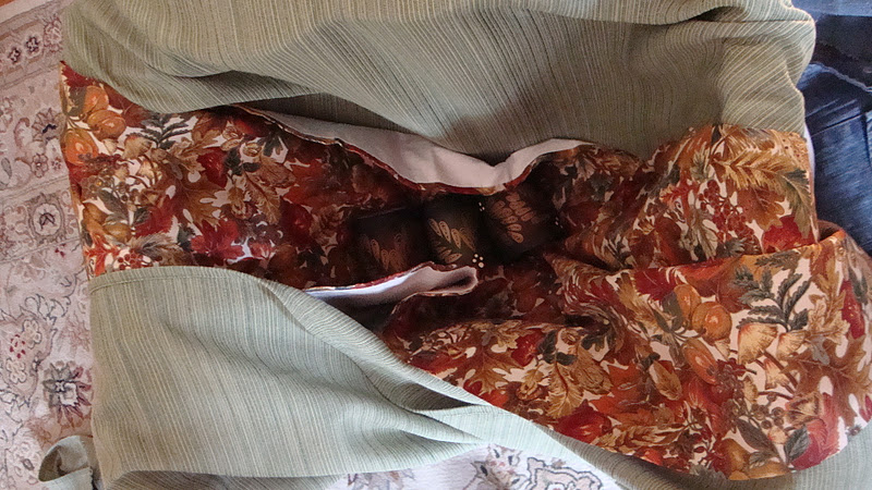 Below: I couldn’t have done this if I tried. Setting down my music bag on a dining room chair the other day, the bag caught the edge of the fall-decorated table/cloth and pulled everything off without damaging a thing.