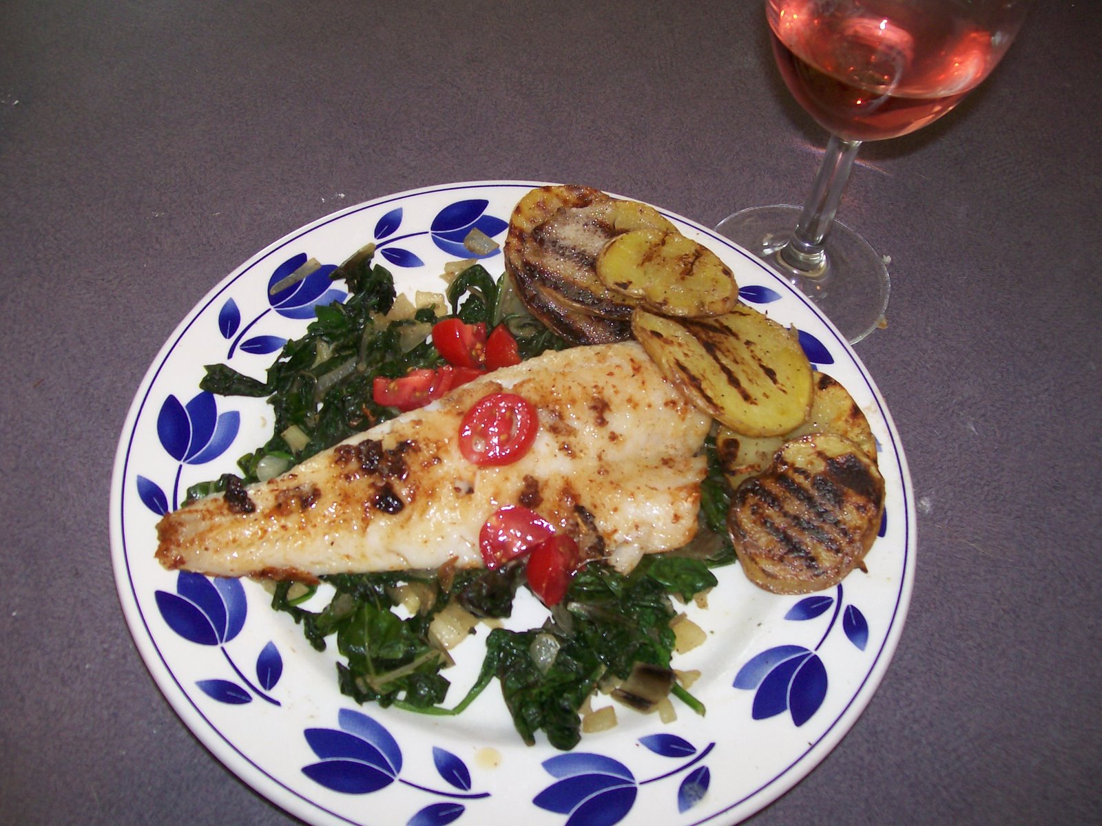 Divide vegetables between plates containing potatoes and top chard with a piece of fish, reserving third piece for seconds for hungry person. (Or tomorrow’s eggs) Garnish fish with chopped tomato and serve while warm.