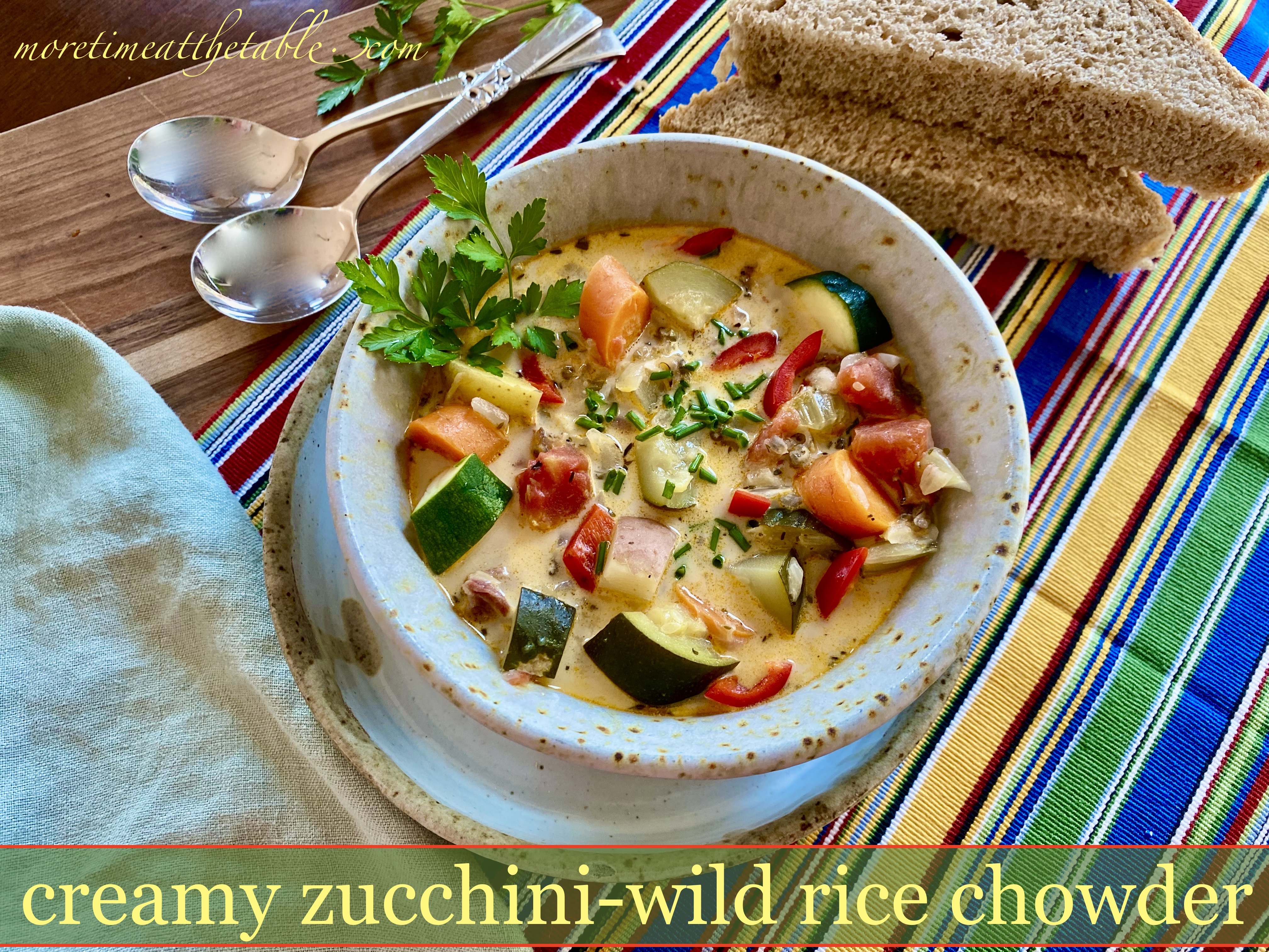 We don’t always associate soup with summer, but in the same way fresh, sweet-scented peach pie demands to be baked in the dog days of August, we have to stir up zucchini soup at the exact moment the counter begins piling up once again with unending stacks of zucchini (tomatoes, cabbage…). Or when a very inexpensive, but large bag of zucchini somehow gets into our cart at Costco. And we get home only to wonder just what to do with all of that squash.